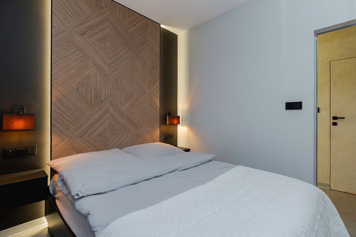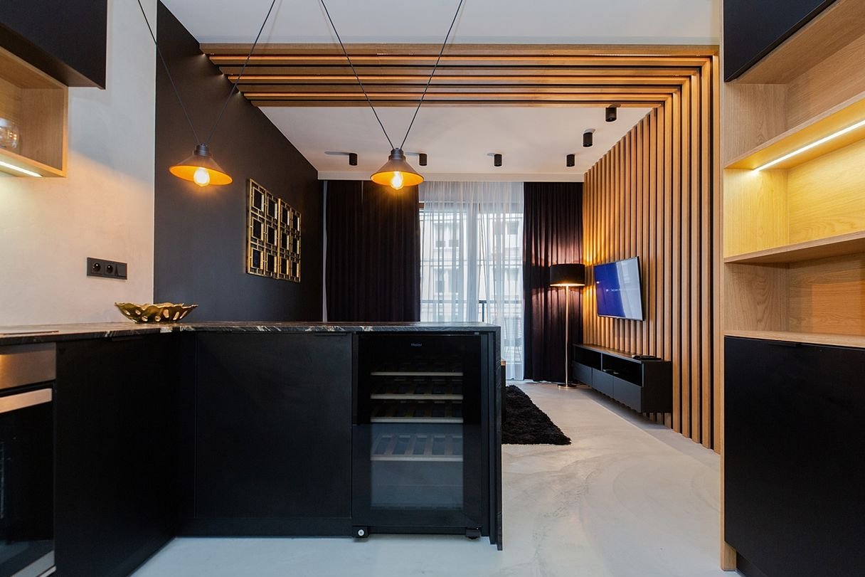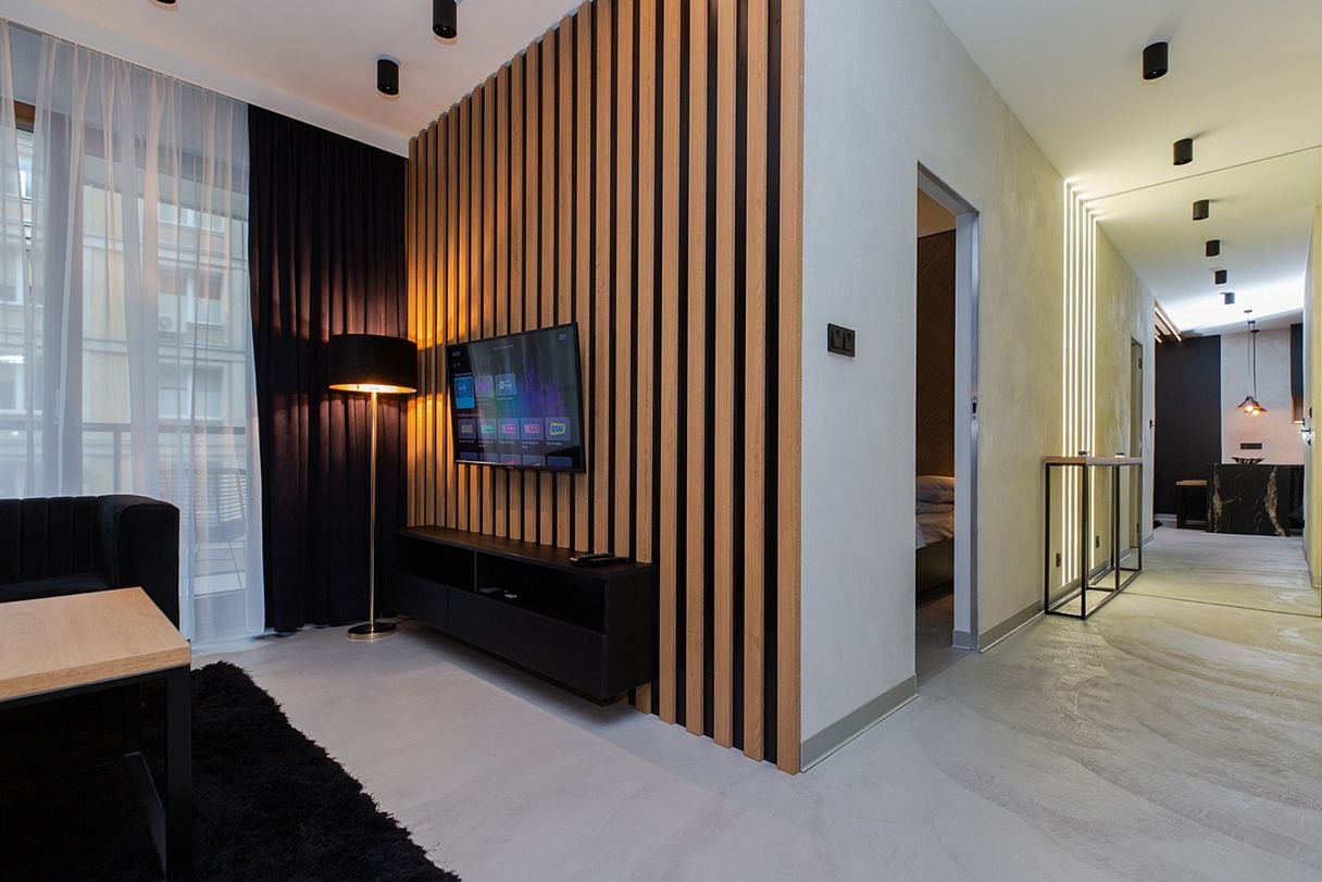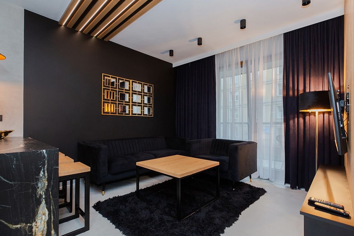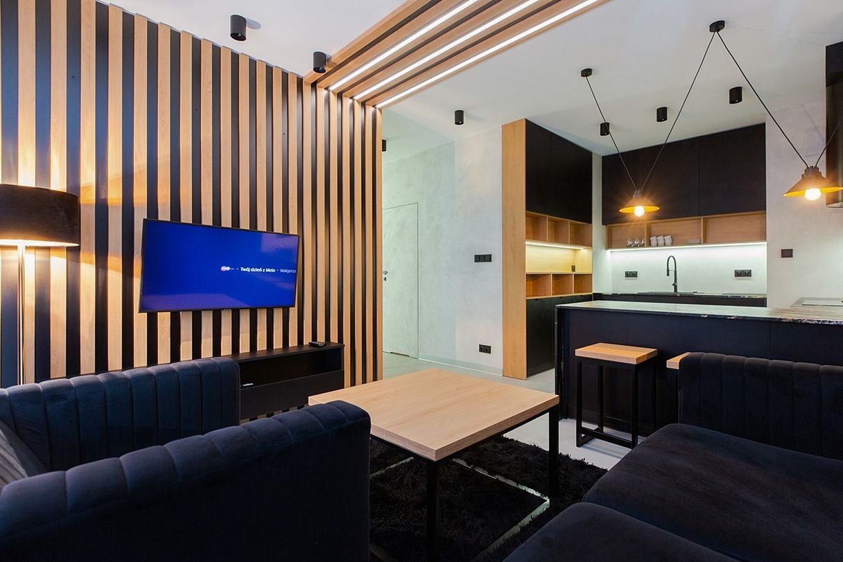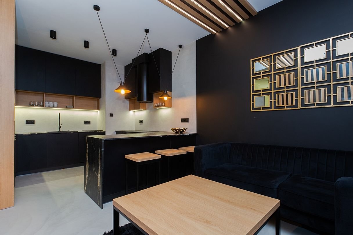 Wnętrze zostało zaprojektowane przez projektanta w nowoczesnym, eleganckim stylu z akcentami loftowymi: połączenie czerni, naturalnego drewna, nastrojowego oświetlenia oraz wyrazistych struktur materiałów daje ponadczasowy charakter.