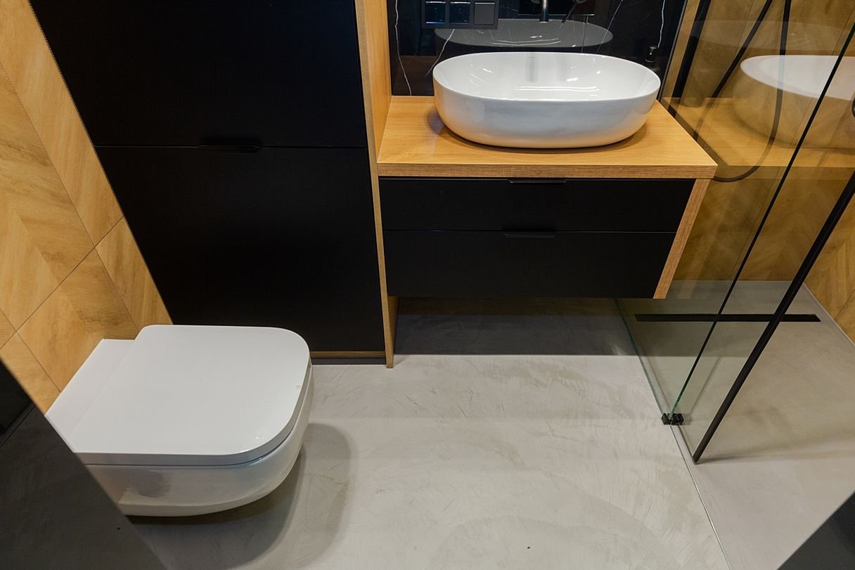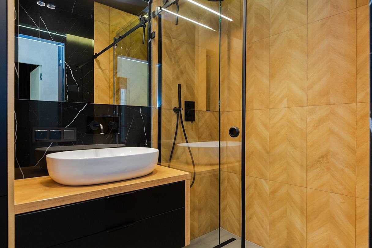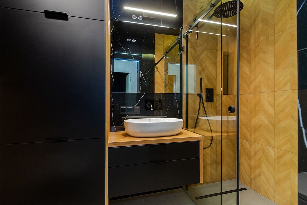 łazienka w nowoczesnym standardzie: przeszklony prysznic typu walk-in, elegancka armatura, zabudowa i duże formaty okładzin