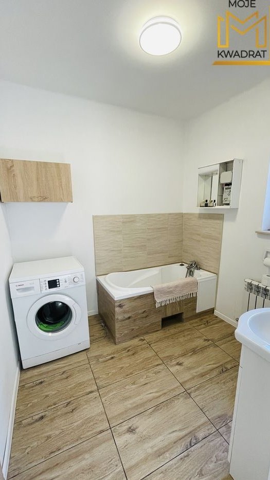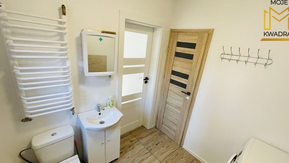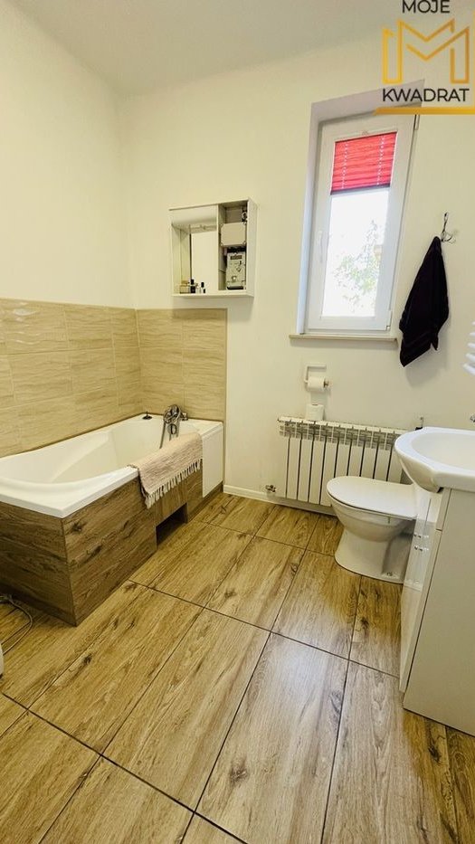 Woda ogrzewana z bojlera 80l, natomiast cały dom ogrzewany z pieca na węgiel. W korytarzu i łazience ogrzewanie podłogowe.