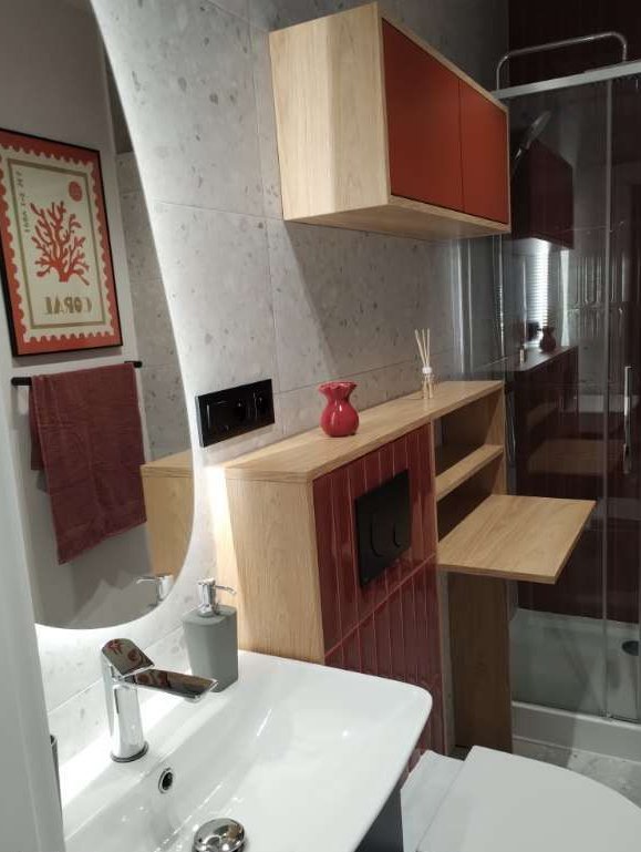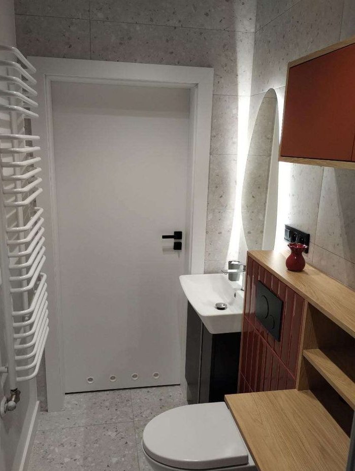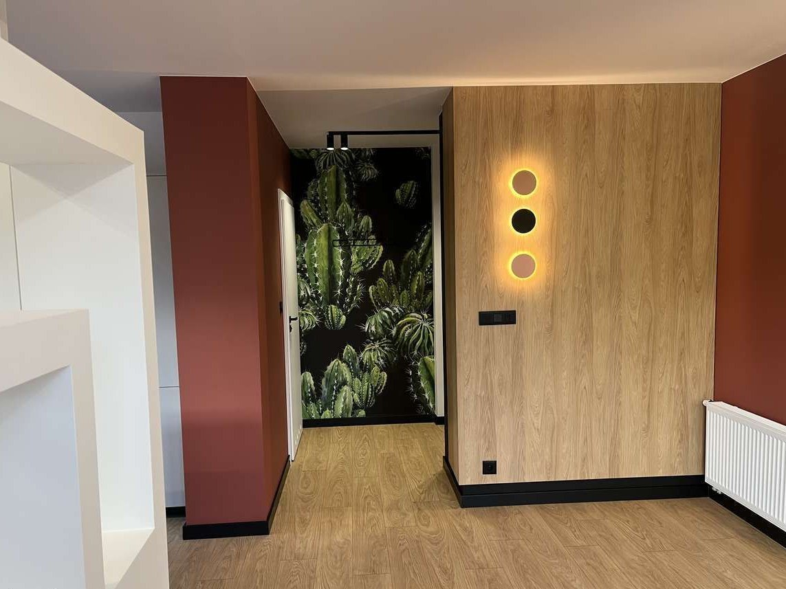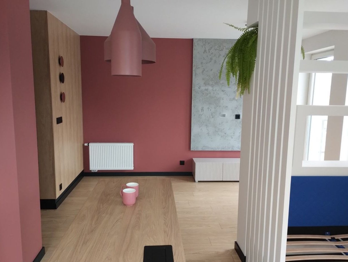 Mieszkanie składa się z salonu z aneksem kuchennym, wydzielonej sypialni, którą można przerobić jako zamknięty pokój , łazienki z wc oraz przedpokoju. Mieszkanie urządzone w wysokim standardzie. Meble w kuchni i łazience wykonane na wymiar przez stolarza. Kuchnia wyposażona w AGD firmy Beko: piekarnik, zmywarka, płyta indukcyjna, lodówka no frost. Na podłodze wysokiej jakości panele. Łazienka wykończona glazurą i terakotą wyposażona w kabinę prysznicową z deszczownicą, umywalkę, podświetlane lustro oraz wc, podejścia przygotowane pod pralkę. W całym mieszkaniu oświetlenie renomowanej firmy Nowodvorski.