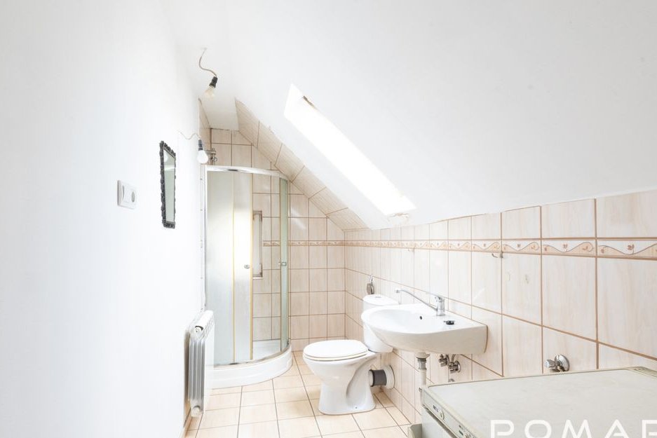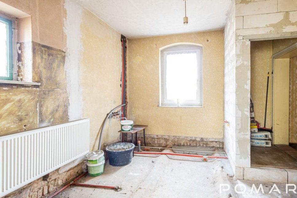 Piętro: częściowo wykończone i zagospodarowane – znajduje się tu kuchnia i łazienka; pomieszczenia wymagają odświeżenia.