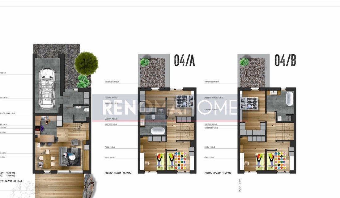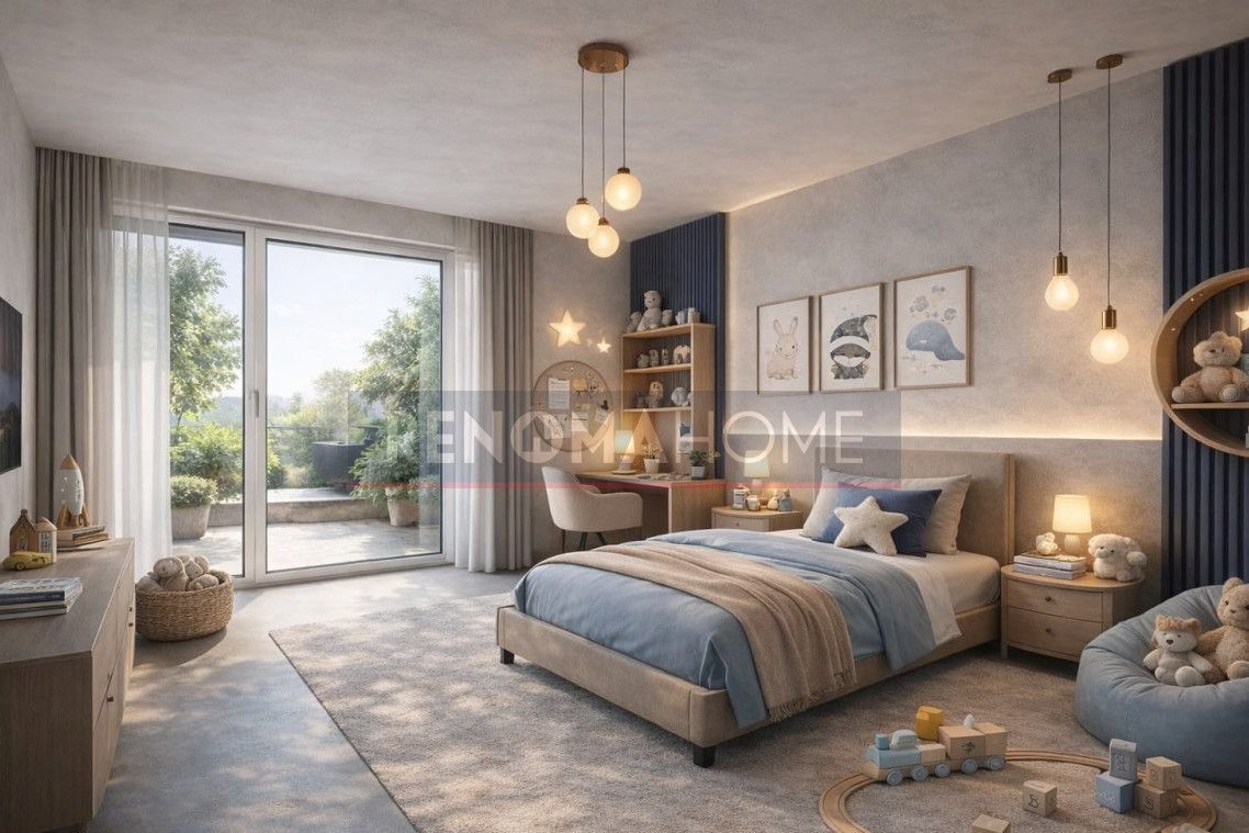 Piętro stanowi strefę prywatną z trzema pokojami, garderobą oraz komfortową łazienką. Układ pomieszczeń pozwala na wygodne zaaranżowanie sypialni i gabinetu do pracy.