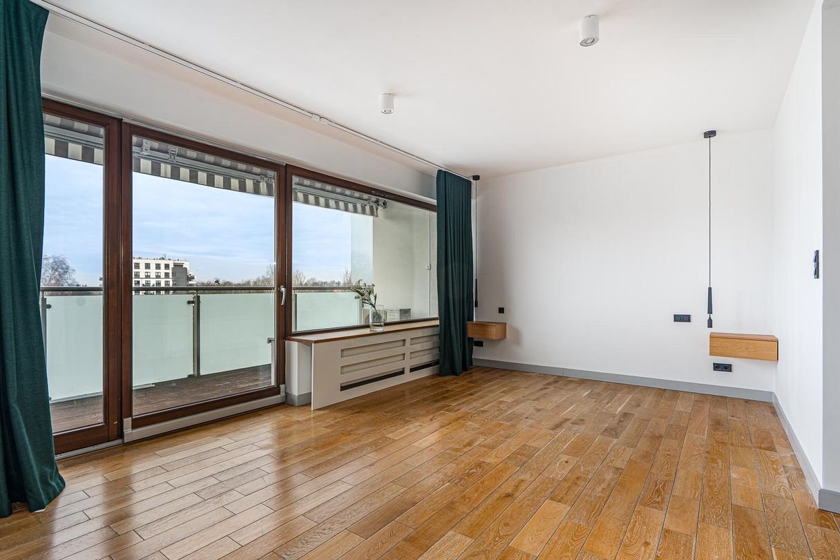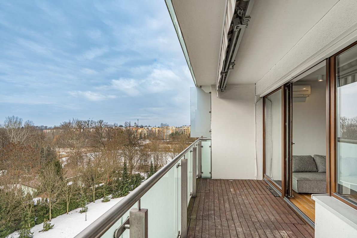 Wisienką na torcie tego penthouse są dwa całkiem spore i wygodne (bo szerokie) tarasy z widokiem na duży, zielony teren Mariny i co najważniejsze! Nic nam tego widoku nie zasłania. To miejsce działa kojąco o poranku, kiedy jeszcze w szlafroku pijesz tam kawusie i również rozluźnia wieczorową porą z lampeczką wina.