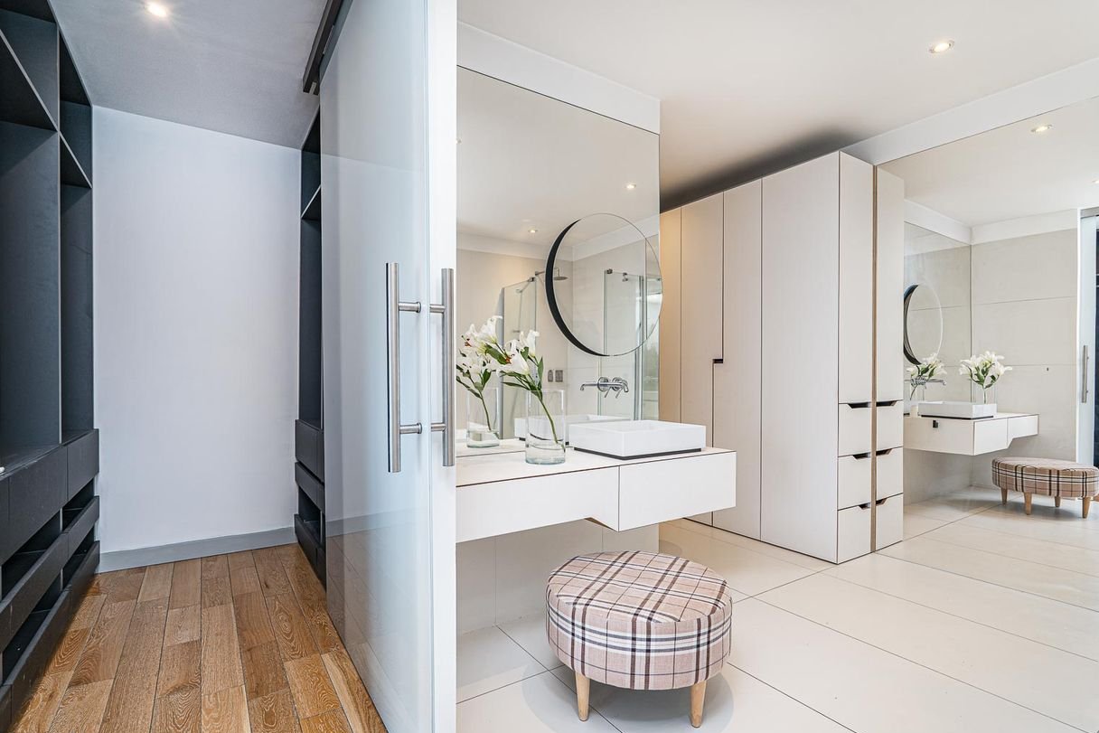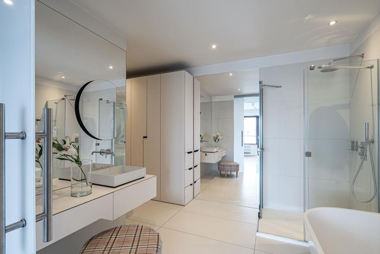 Duży hall, który dzieli się na dwie części, prowadzi od wejścia do strefy dziennej, salonu z aneksem kuchennym i dużą, wygodną wyspą. Głęboka czerń w połączeniu z szarością pokazuje, że mocny akcent też tutaj świetnie stroi. Jeśli jednak to nie Twój styl, wystarczy mały lifting w postaci wymiany frontów i masz nową… swoją kuchnię. Druga część to strefa wypoczynku z sypialnią główną. Prawdziwy master bedroom - przestronna sypialnia, (dobrze doświetlona sporym przeszkleniem tarasowym), z niej wchodzisz do pojemnej garderoby a następnie do olbrzymiego salonu kąpielowego z wygodną wanną, idealną do domowych rytuałów SPA jest też prysznic na krótsze kąpiele. Duże lustro to niezbędna rzecz takiego miejsca, więc jest i ono! Na całej ścianie, idealne do przymiarek przed wielkim wyjściem. To jeszcze nie wszystko, bo na takie wyjście, niesamowity make-up można wykonać przy bardzo funkcjonalnej toaletce i to jest największy sztos tego pomieszczenia! W bocznej części salonu kąpielowego została ukryta toaleta i bidet, tam też znajdziesz kolejną zabudowę do przechowywania.