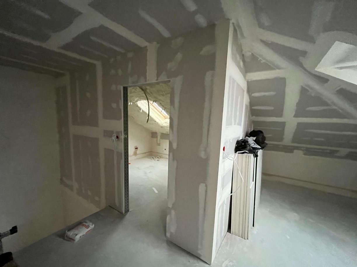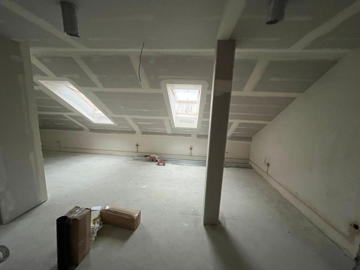 Duże poddasze do własnej aranżacji np. na 2 lub 3 pokoje i małą łazienkę. Minimalna wysokość poddasza to 110cm – co sprawia, że może być ono w pełni użytkowe (po adaptacji). Galeria przedstawia 3 zdjęcia z jednego z lokali w którym zostało ono zaadaptowane na : gabinet, duży open space, łazienkę i garderobę.