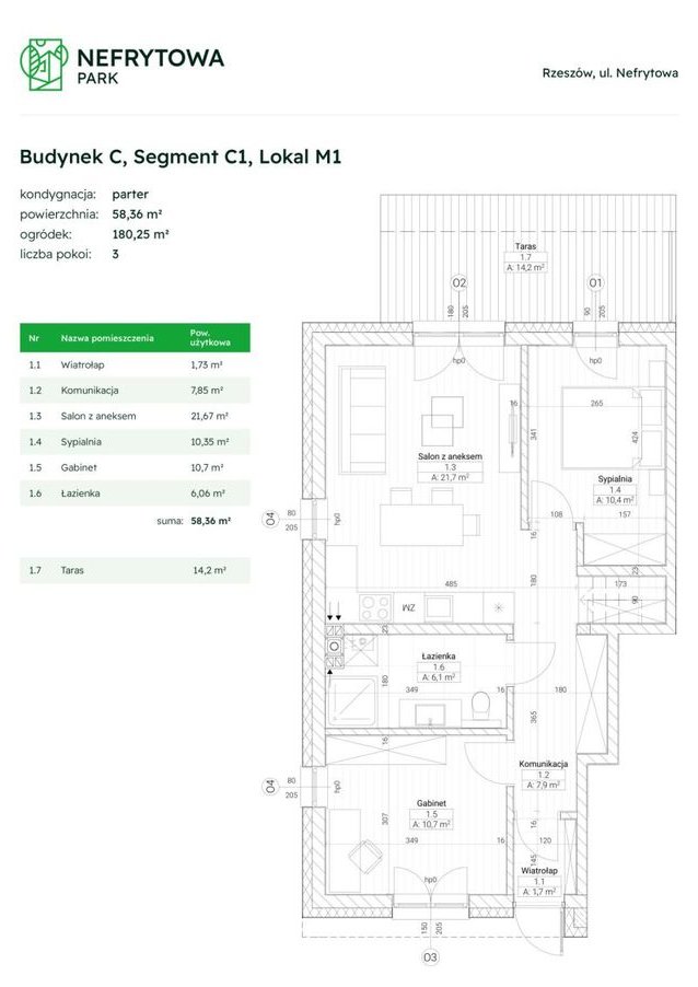 OFERTA DOTYCZY MIESZKANIA NA PARTERZE O POWIERZCHNI 58,36 M2 Z PRYWATNYM SKRAJNYM OGRODEM O POWIERZCHNI180 M2.