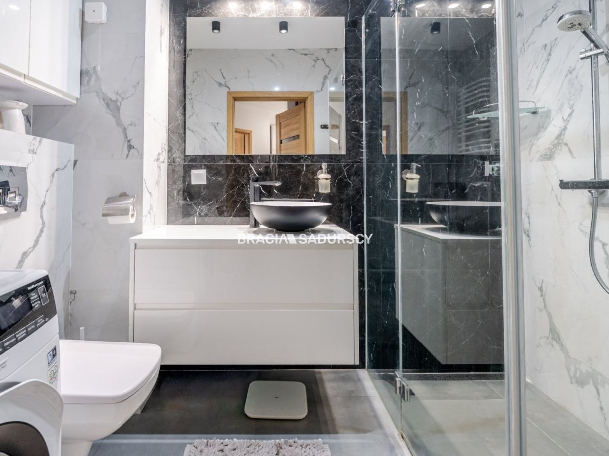 Opis wnętrzaNa powierzchnie mieszkania składają się dwa niezależne pokoje o pow. 14,5 i 10,5 m2 - oba pokoje z rozkładaną sofą, bardzo pojemną szafą oraz miejscem do pracy. Dzięki przemyślanemu projektowi oba pokoje są w pełni funkcjonalne i zapewniają prywatność.KuchniaNowoczesna, w pełni wyposażona, z zabudową wykonaną na wymiar. Przestrzeń została zaprojektowana tak, aby wygodnie korzystały z niej dwie osoby mieszkające niezależnie. Dobrej klasy sprzęty AGD i dużo miejsca do przechowywania.ŁazienkaElegancka łazienka w bieli i czerni. Kontrastowe połączenie czarnych akcentów z białymi powierzchniami tworzy nowoczesny, luksusowy charakter. Dobrej jakości armatura, duże lustro, zabudowa meblowa oraz wygodna kabina prysznicowa nadają wnętrzu hotelowy standard.