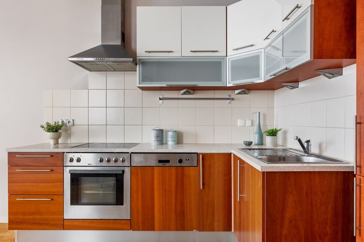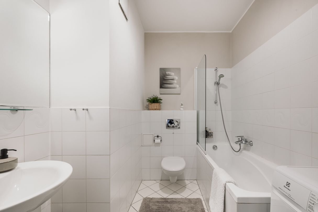 The flat stands out for its functional layout and excellent use of space. It is fully furnished and equipped with Zanussi appliances – ready to move into without any additional expenditure. The hallway features two spacious built-in wardrobes, providing convenient storage. The kitchen has been thoughtfully designed – it offers plenty of work space whilst maintaining a light and aesthetic feel.