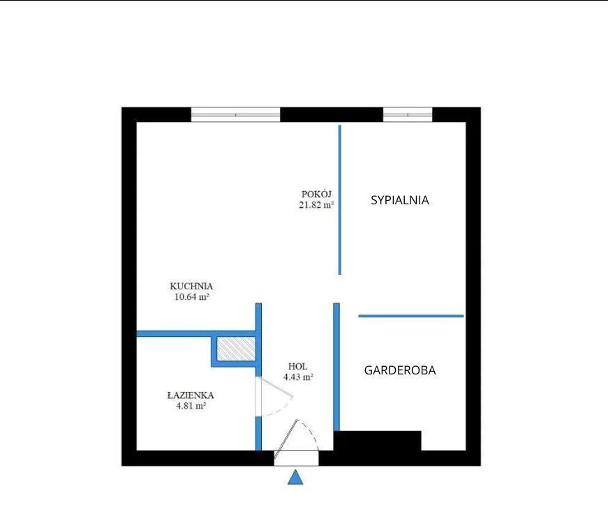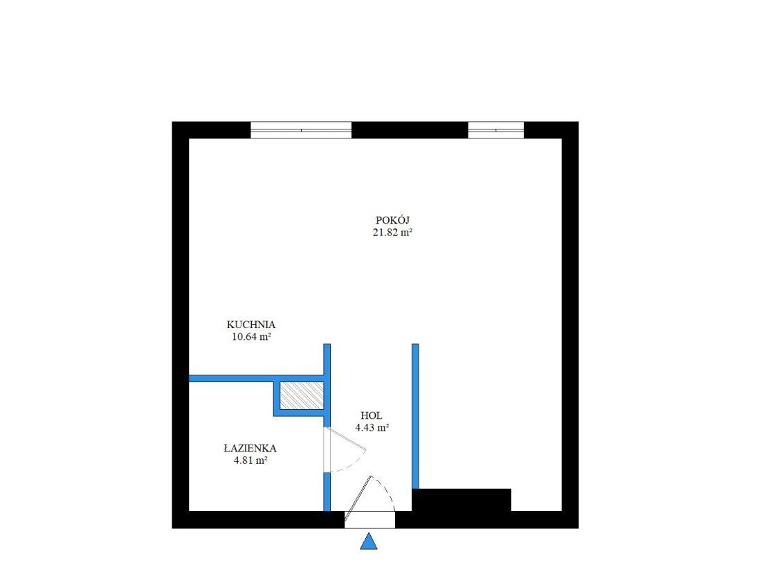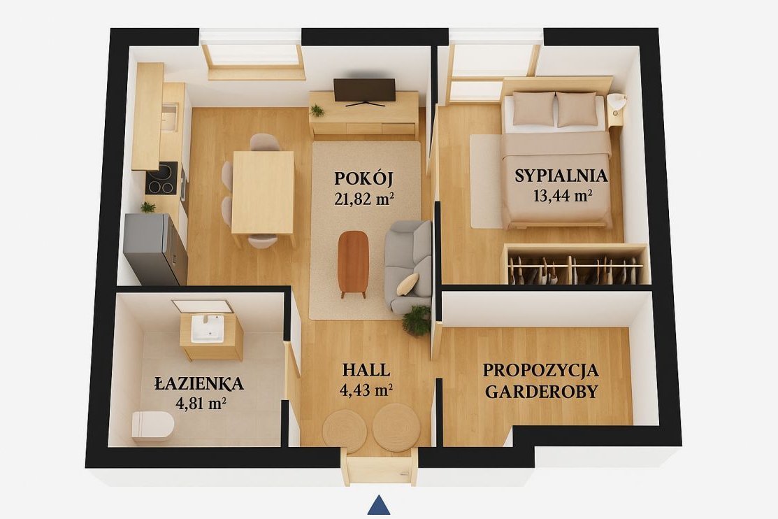 Układ mieszkania daje wiele możliwości - nowy nabywca może w prosty sposób wydzielić pełnowymiarową sypialnię oraz niewielką garderobę, zachowując przy tym otwarty, nowoczesny charakter wnętrza.