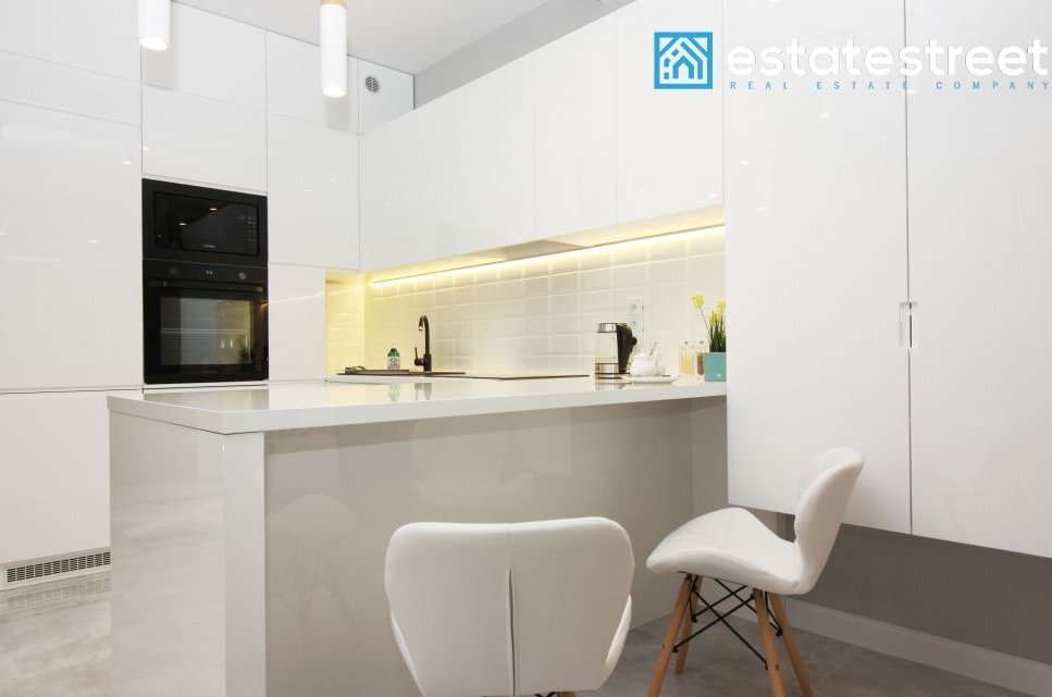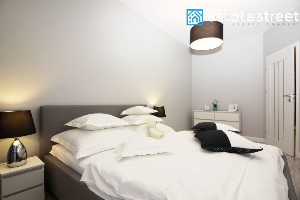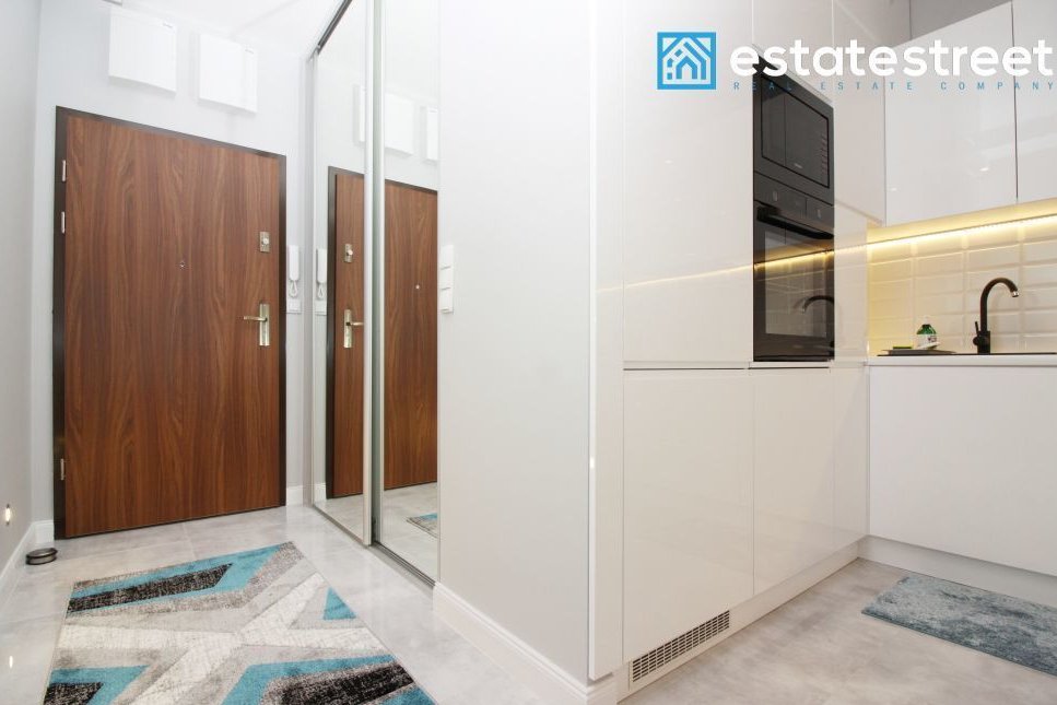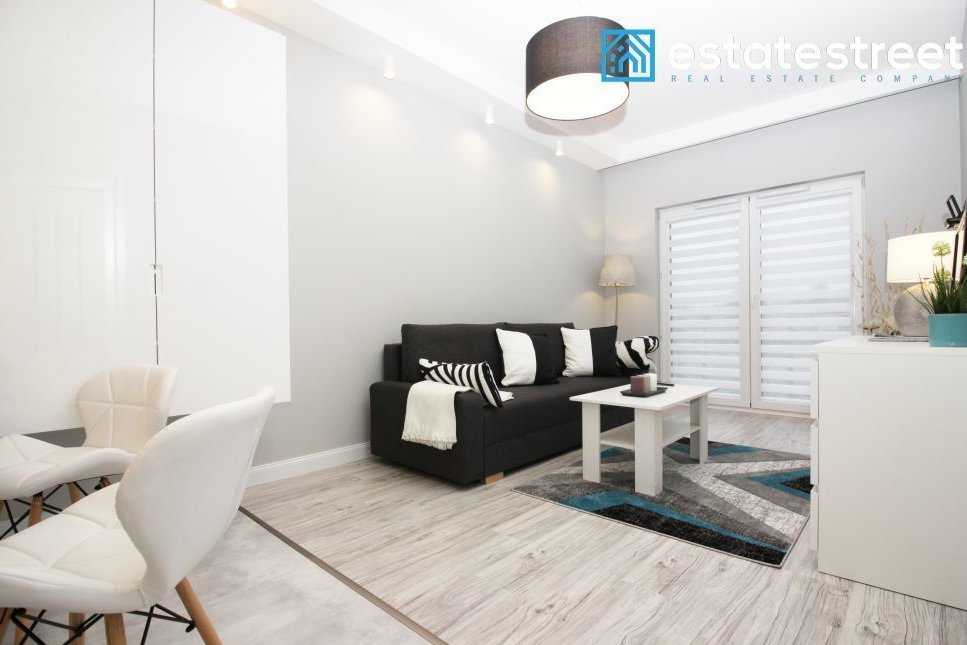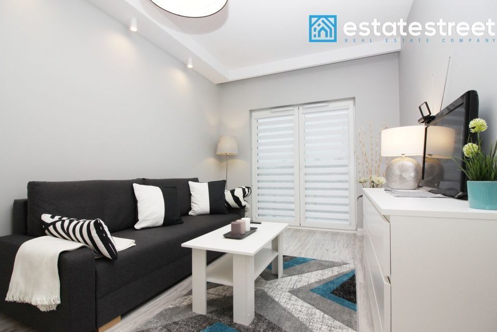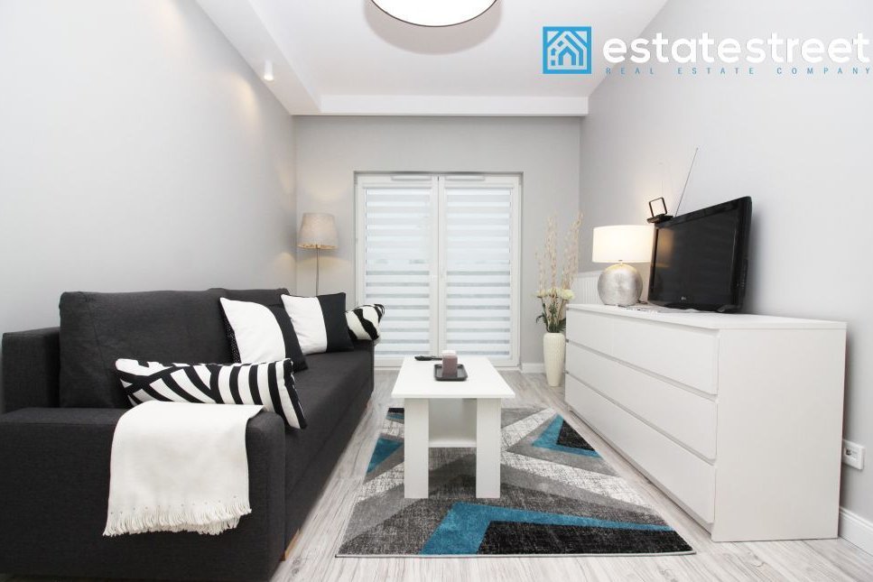 The apartment is located on the first floor of a modern building built in 2018. The 47.02 m² apartment comprises a living room with a kitchenette, a bedroom, a separate walk-in closet, a hallway, and a bathroom. The apartment is fully furnished and equipped – included in the price! The living room includes a sofa bed, a coffee table, a cabinet, and a TV. The open-plan kitchen is equipped with high-quality appliances, including a dishwasher. A comfortable double bed measuring 160cm x 200cm and a chest of drawers in the bedroom. The bathroom has a shower and underfloor heating. A spacious, separate wardrobe with ample storage space is available. The interior is cozy, spacious, and bright – south-facing. The apartment also includes a balcony, allowing for moments of relaxation and rest. A parking space is available in the underground garage, right next to the elevator. Municipal heating and water, PVC windows, a burglar-proof door, TV installations, and internet access are available. The monthly rent is approximately 650 PLN.