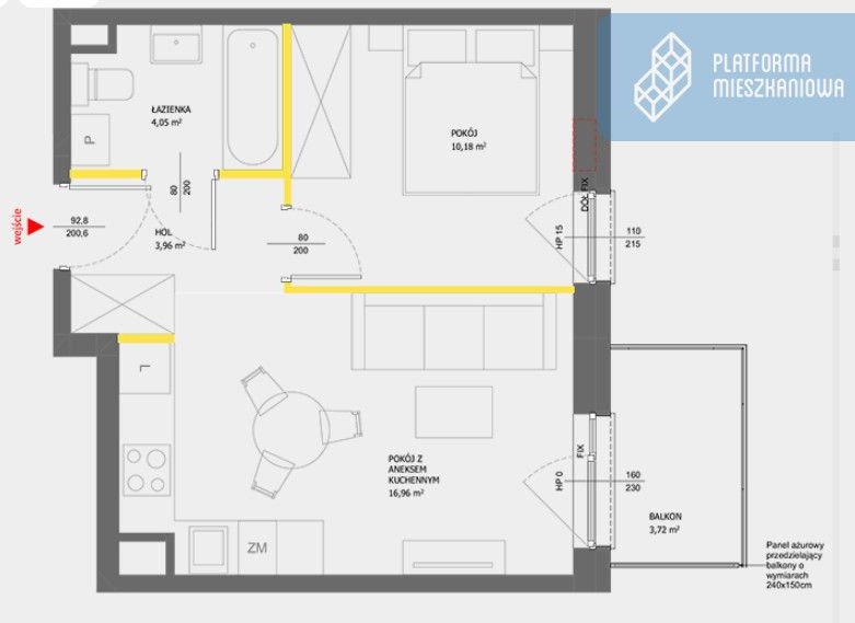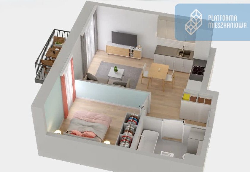 - Przestronny salon z aneksem kuchennym i wyjściem na balkon