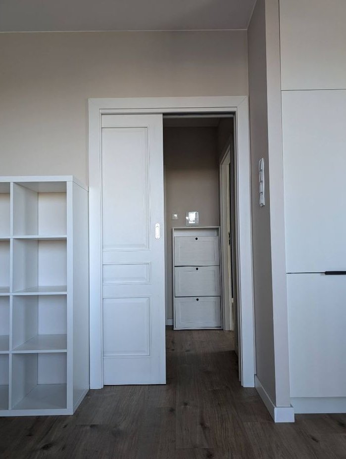 drzwi przesuwne chowane w ścianie – salon może pełnić funkcję dodatkowej sypialni