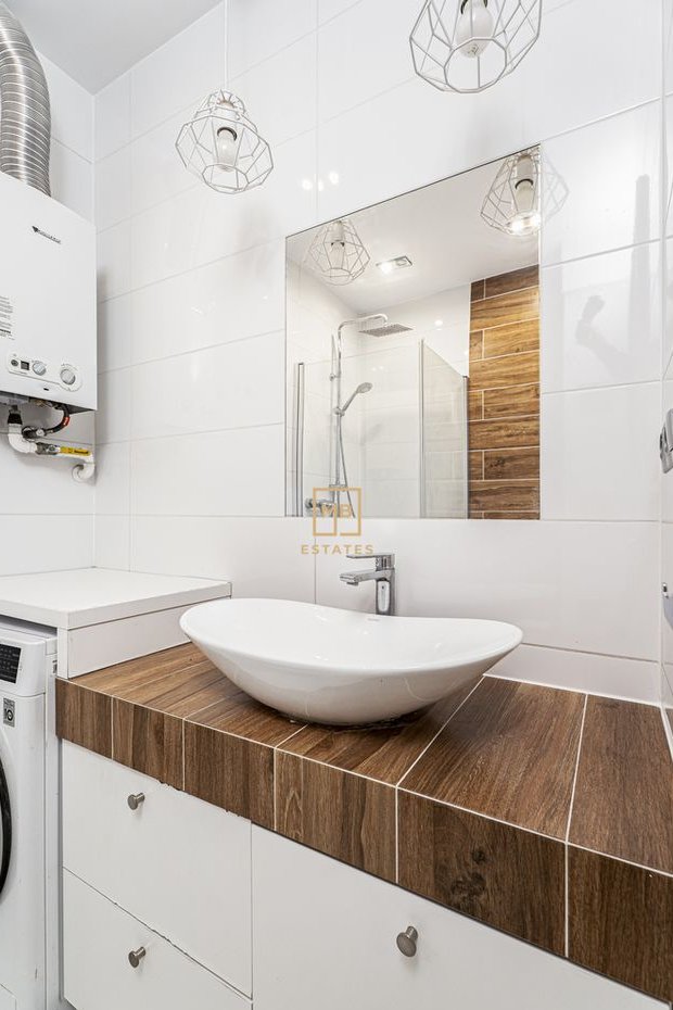 Łazienka i kuchnia wyposażone są w ogrzewanie podłogowe — komfort, który robi szczególną różnicę w chłodniejszych miesiącach. Obie przestrzenie są w pełni wyłożone płytkami. Kuchnia to oddzielne, duże pomieszczenie — rzadkość w tej kategorii metrażu — wyposażone w kompletne umeblowanie oraz sprzęt AGD gotowy do użytku. Płyta indukcyjna, funkcjonalny układ — można wprowadzić się i gotować już pierwszego dnia.