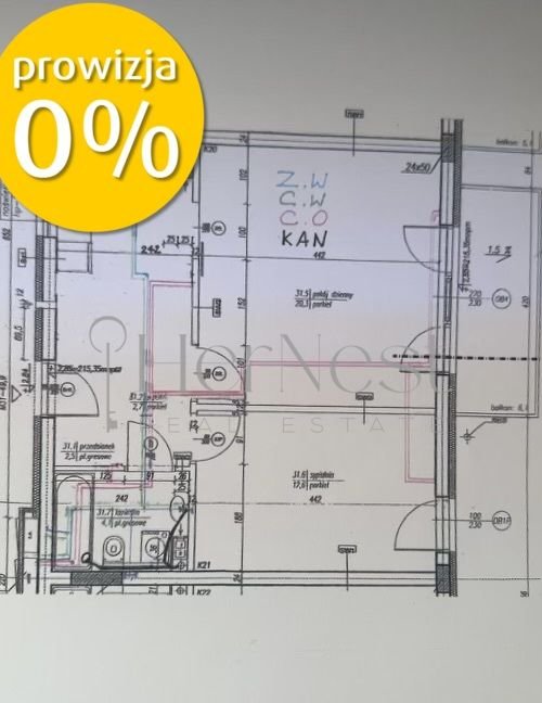 Na rzucie znajduje się podział mieszkania przed zmianami- bez garderoby i z większą kuchnią.