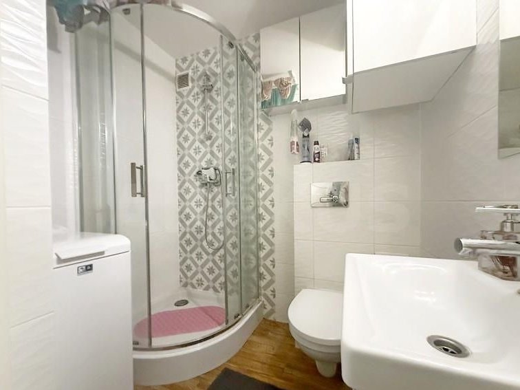 Łazienka z kabiną, na ścianach glazura, na podłodze terakota.