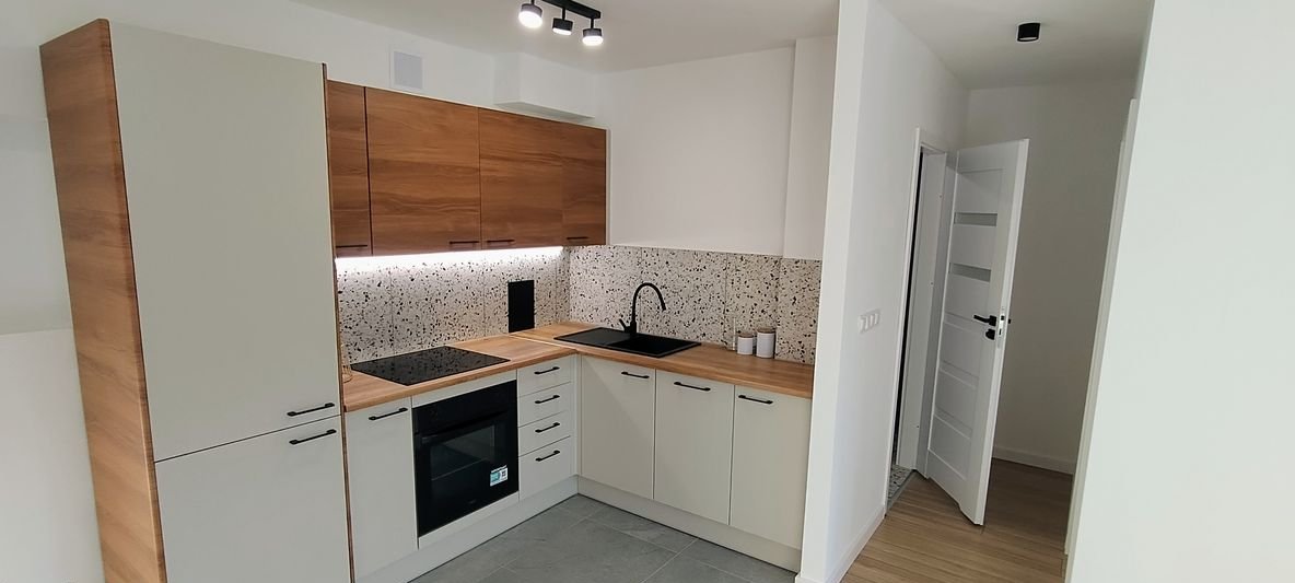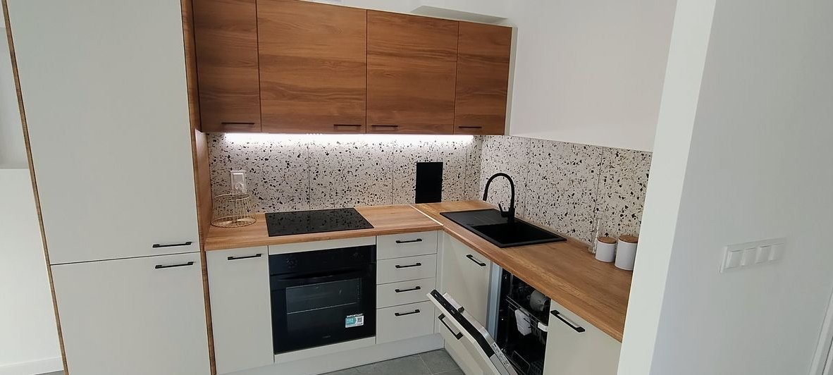 W kuchni nowa zabudowa kuchenna na wymiar wraz z urządzeniami: pochłaniacz, piekarnik, płyta indukcyjna, zmywarka.