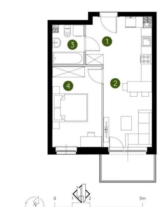 salon z aneksem kuchennym z wyjściem na balkon od strony południowej
