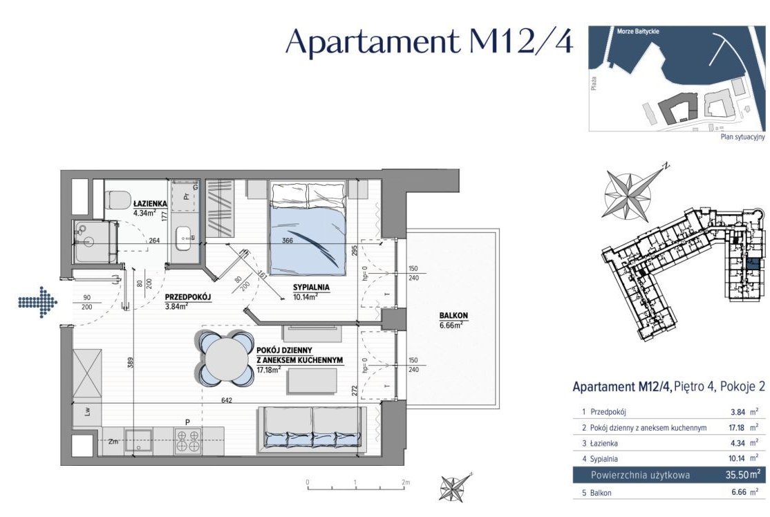 Apartament 35,50 m² + balkon 6,66 m²; składa się z: