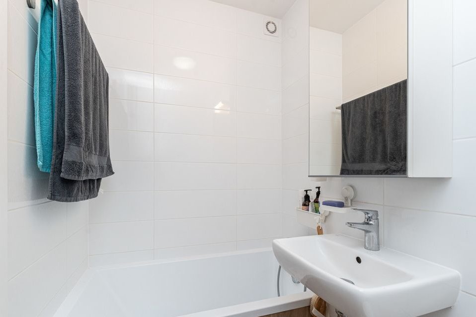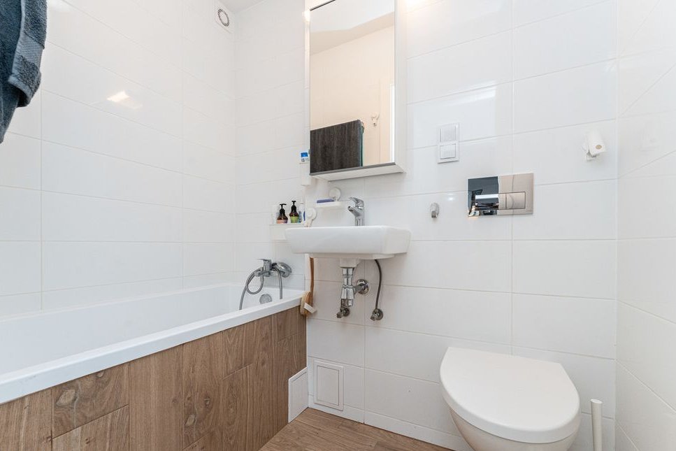 Łazienka ma ok. 3m2 i znajduje się w niej umywalka, wanna, WC oraz szafka z lustrem do przechowywania rzeczy.