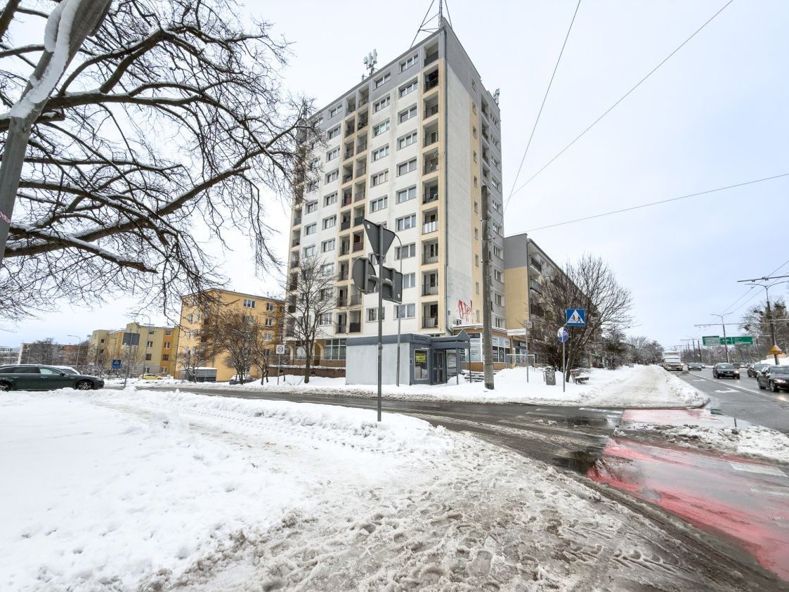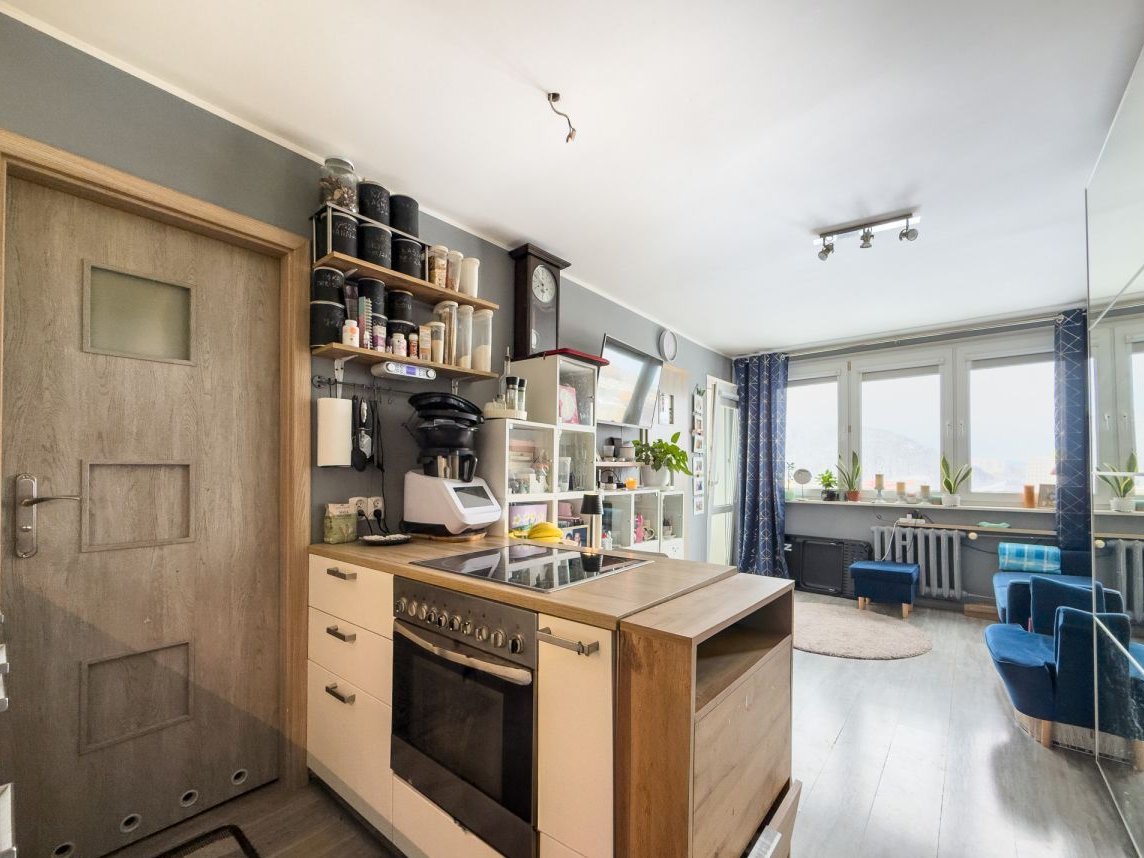 Mieszkanie o powierzchni 27,39 m² znajduje się na 8. piętrze w budynku z 1975 roku, z windą. Zachodnia ekspozycja oraz duże przeszklenia zapewniają bardzo dobre doświetlenie wnętrza i panoramiczny widok, który zmienia charakter przestrzeni, na prywatny "punkt widokowy".
