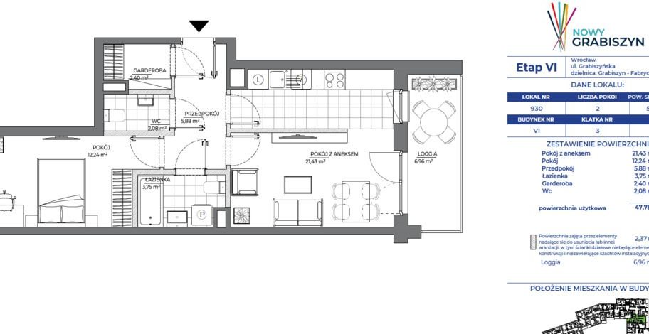 Oferujemy na sprzedaż 2-pokojowe mieszkanie o powierzchni 50,15 m², zlokalizowane na 1. piętrze w nowoczesnej inwestycji Nowy Grabiszyn (Etap VI).