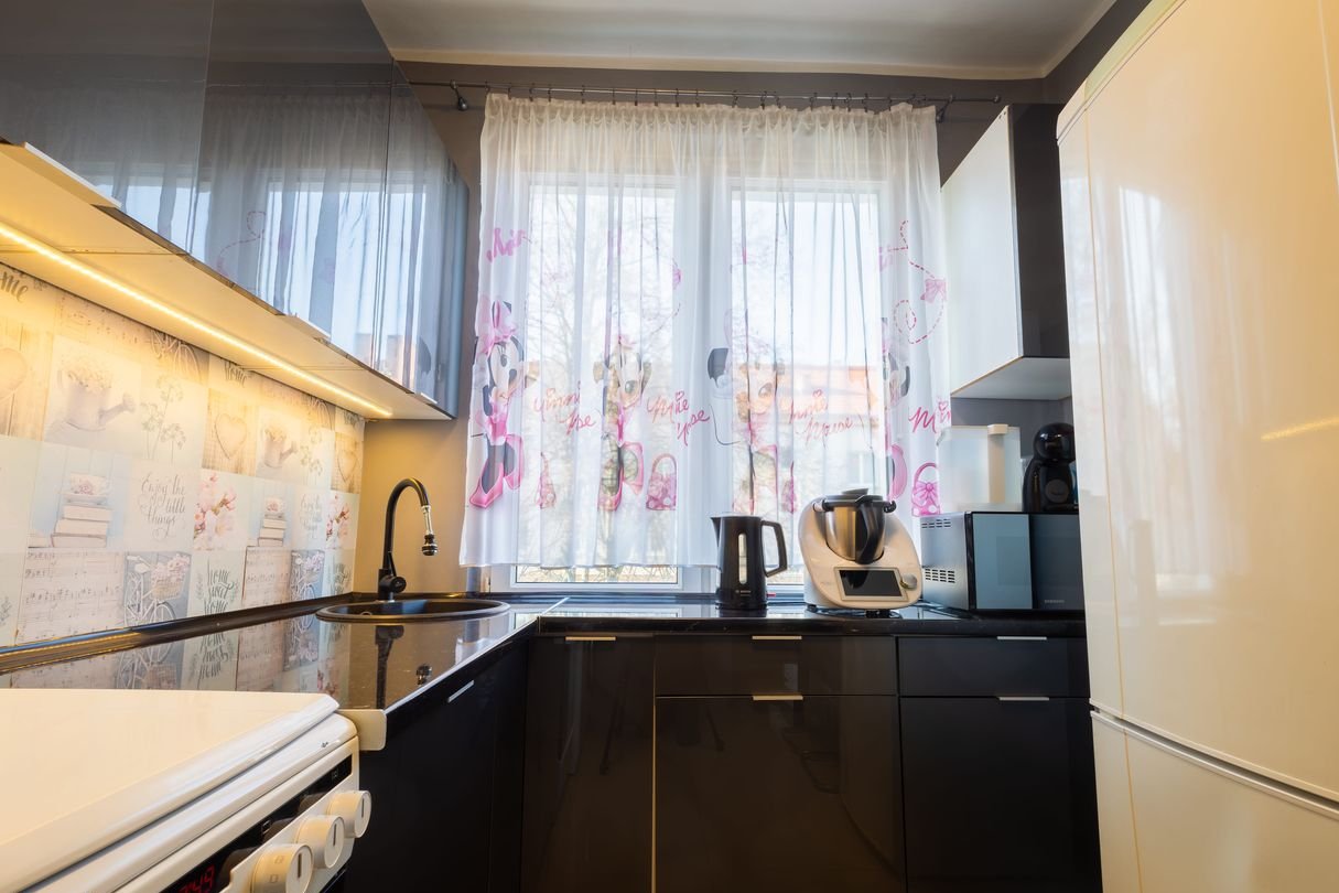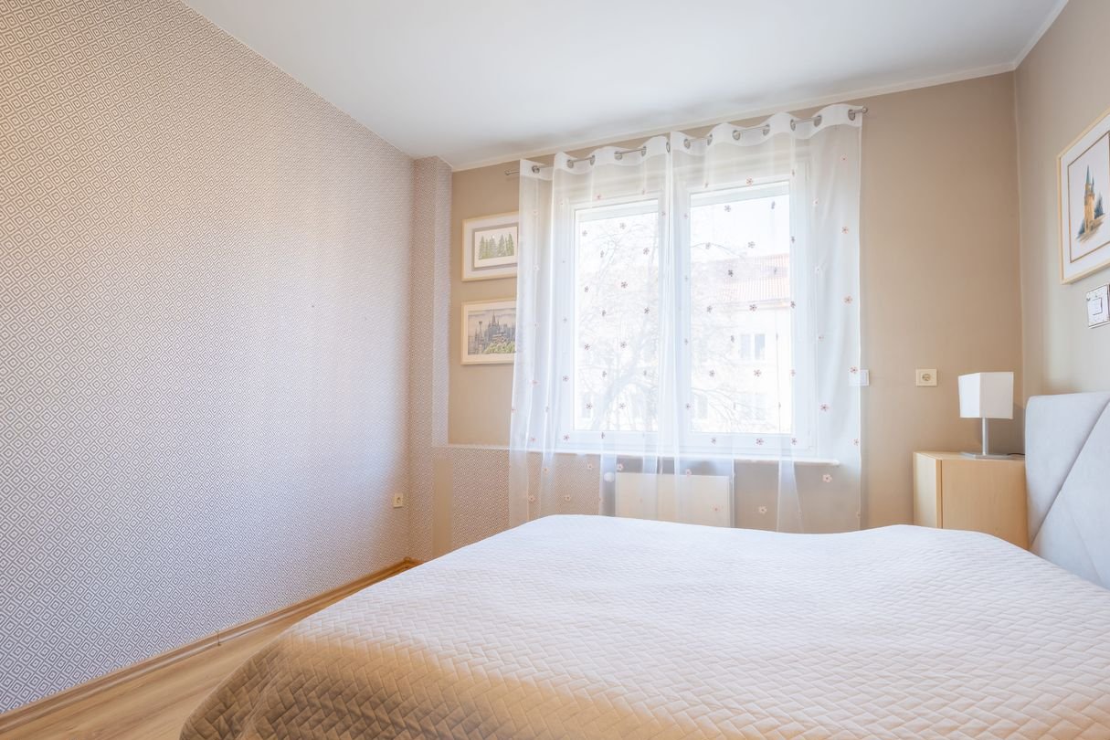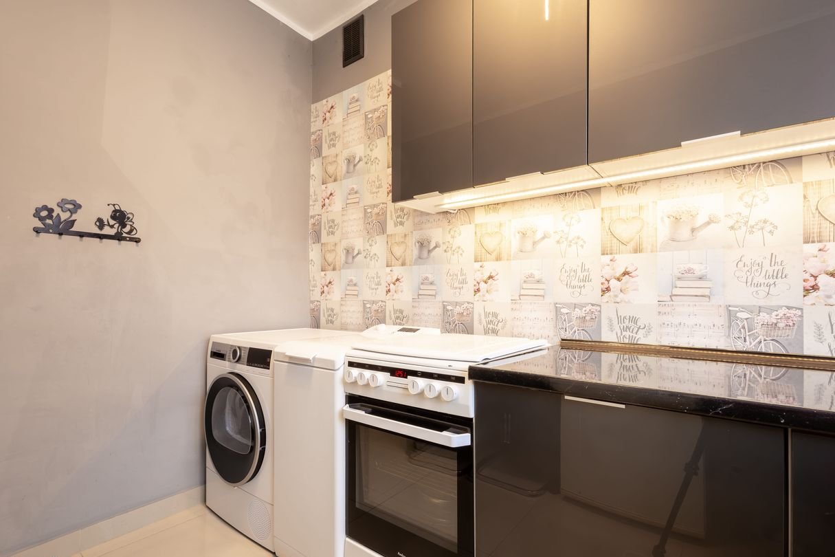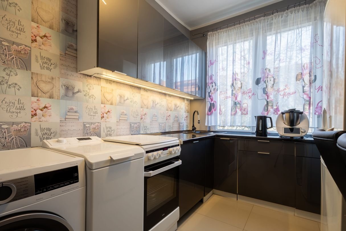 dwa niezależne ustawne pokoje, osobna kuchnia (wraz z pełnym wyposażeniem m.in. zmywarka w zabudowie, kuchenka gazowa z piekarnikiem elektrycznym, lodówka, pralka, kuchenka mikrofalowa)