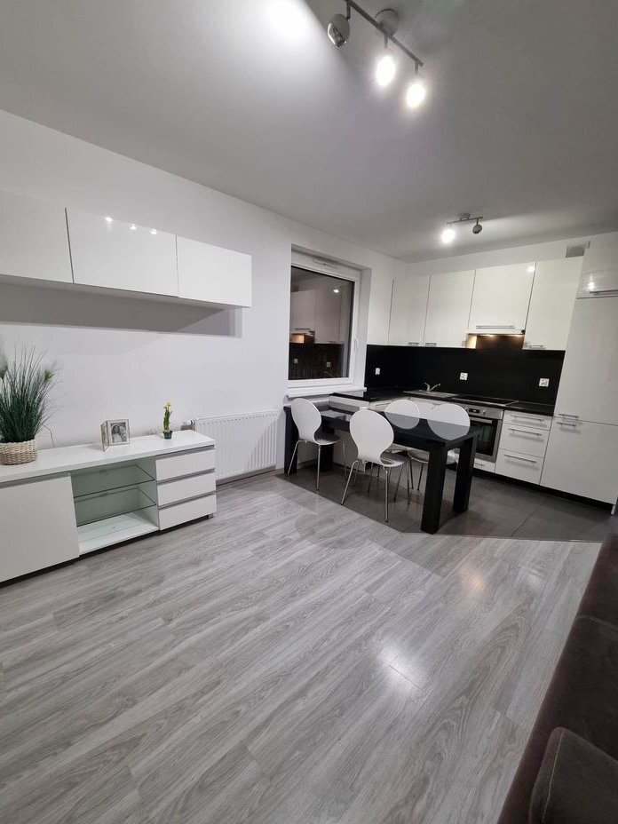 Kuchnia: zabudowa kuchenna w białym połysku z dużą lodówką, zmywarką, płytą indukcyjną, okapem, piekarnikiem, zlewozmywakiem z baterią, ze stołem i wygodnymi czterema krzesłami. W tej części kafle na podłodze.