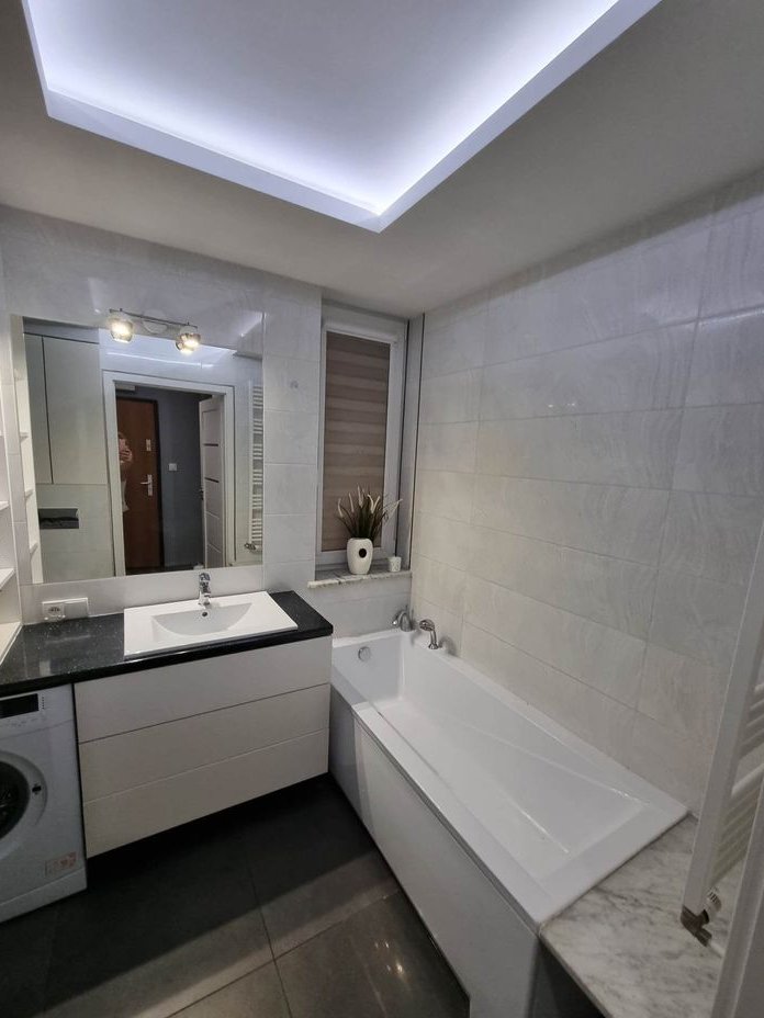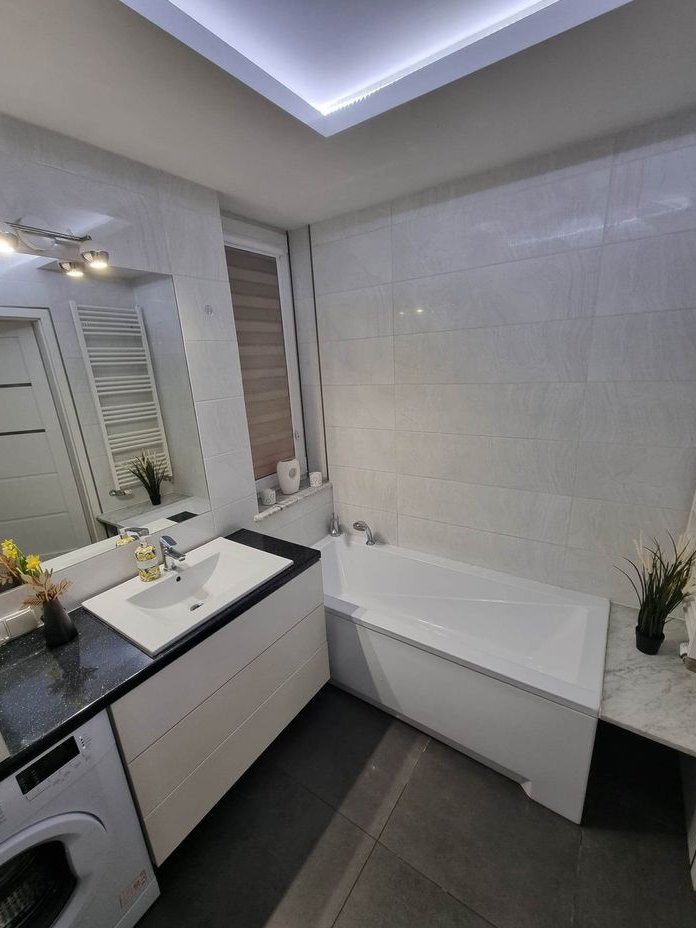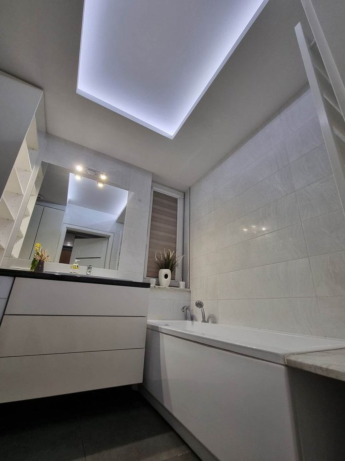 Łazienka: zabudowa geberit z szafką, zabudowa pralki z umywalką i dużą półką na kosmetyki, zabudowana wanna, sufit podwieszany, oświetlenie ledowe. Kafle w całym pomieszczeniu.