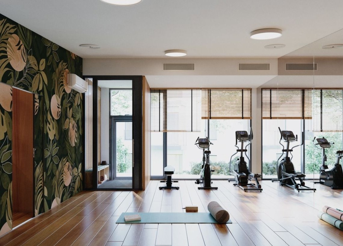 sala fitness – zaprojektowana w duchu „zen”, wyposażona w drabinki i akcesoria do ćwiczeń typu cardio, joga, pilates czy stretching.