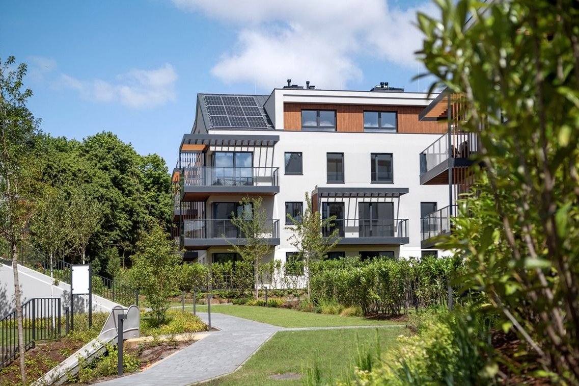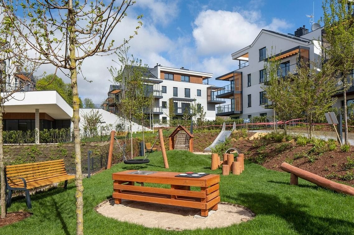 Przestrzenie wspólne zaprojektowano z dbałością o ekologię i estetykę – bogate nasadzenia, naturalnie ukształtowana zieleń, ogrody deszczowe oraz zielone dachy tworzą harmonijną i przyjazną atmosferę. Dopełnieniem są panele fotowoltaiczne, miejsca rekreacyjne, stacja pogodowa z czujnikiem jakości powietrza, poidełka dla ptaków oraz budki dla motyli. Najmłodsi mieszkańcy mogą korzystać z kreatywnego placu zabaw, wykorzystującego naturalne ukształtowanie terenu.