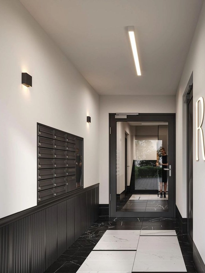 Części wspólne inwestycji Riviera⁵ zostały zaprojektowane z wyjątkowym wyczuciem stylu i detalu. Klasyczna biało-czarna posadzka z subtelnym marmurowym rysunkiem przywołuje ducha paryskich kamienic, a eleganckie wykończenia w ciemnym drewnie i czerni dodają przestrzeni nowoczesnej elegancji.
