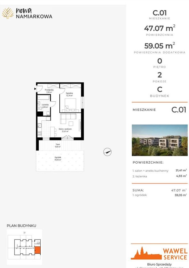 2-pokojowe mieszkanie numer C / C.01 na parterze w budynku C w Inwestycji Nowa Namiarkowa Dewelopera Wawel Service