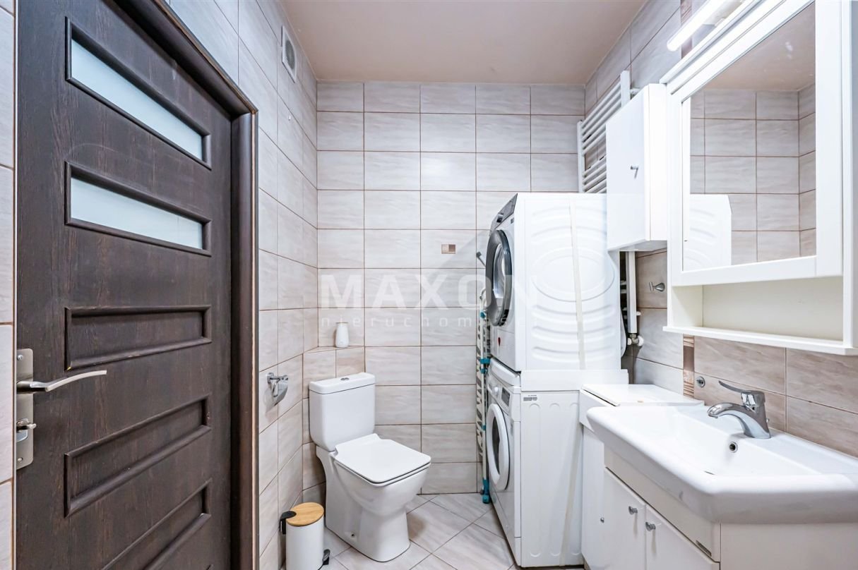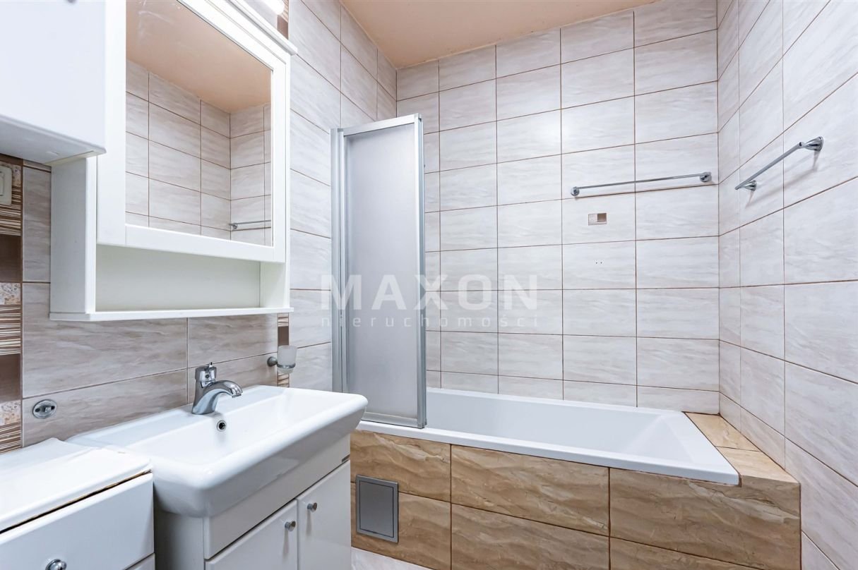 Komfortowa łazienka z wanną z funkcją prysznica. Na wyposażeniu znajduje się pralka oraz suszarka do ubrań (z 2025 roku) – istnieje możliwość pozostawienia ich dla nowego właściciela.