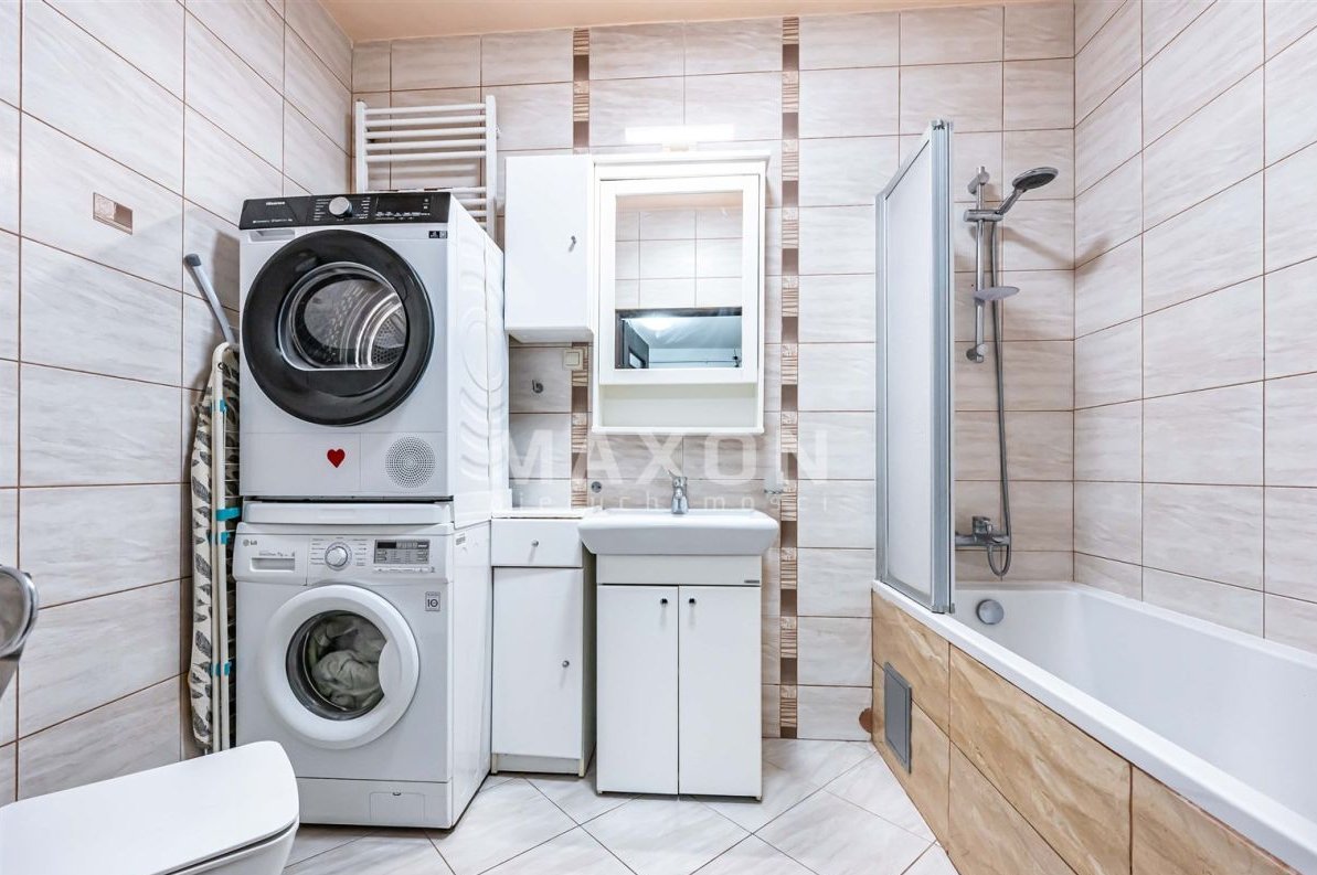 A comfortable bathroom with a bathtub and shower. It is equipped with a washing machine and a clothes dryer (from 2025)—these can be left for the new owner.
