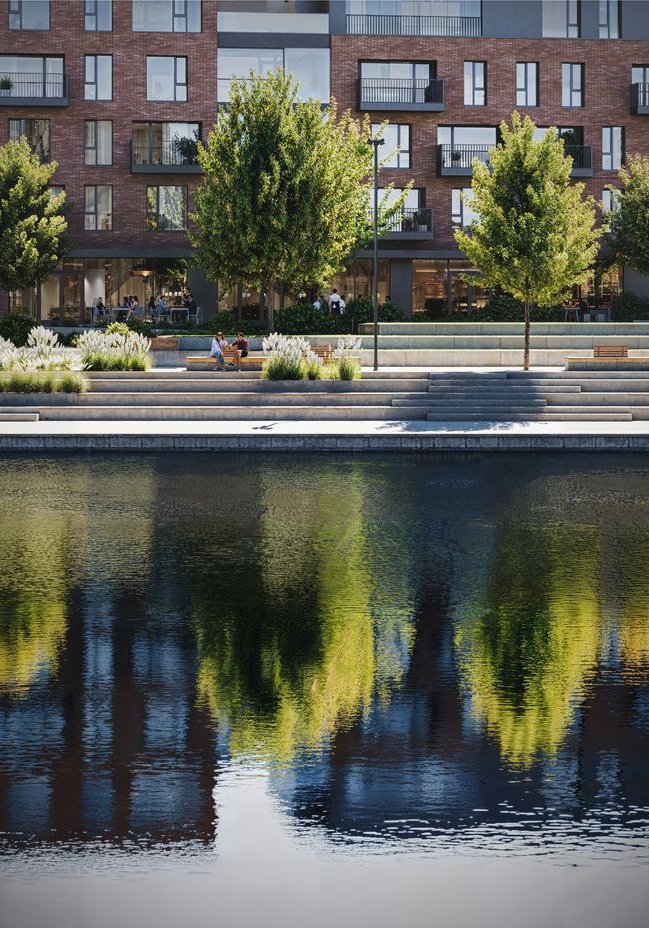 Przestrzenie rekreacyjne: przestronne bulwary, plac wodny i zewnętrzny plac zabaw