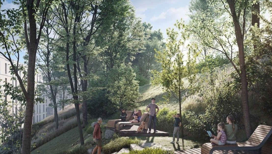 strefa rekreacji na wzgórzu z leżakami i ścieżką spacerową