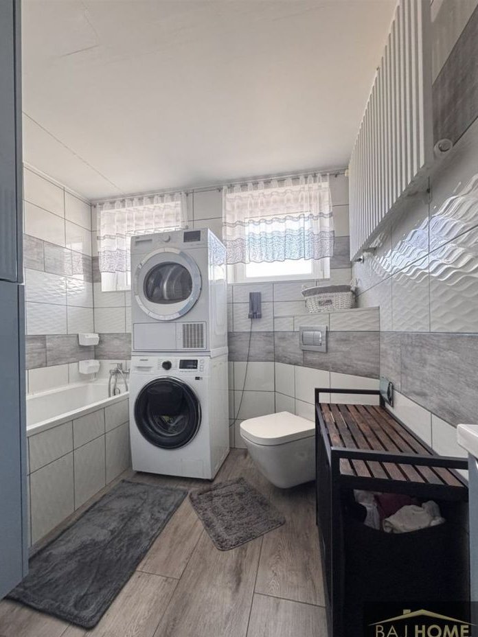 Łazienka pokryta została kaflami i wyposażona w wannę, umywalkę z szafką, szafkę wiszącą zestaw podtynkowy WC oraz lustro. W łazience znajdzie się również miejsce na pralkę i suszarkę.Całości wystroju wnętrza dopełniają drzwi wewnętrzne z ościeżnicami w jasnym kolorze idealnie dobrane do kolorystyki wnętrza.