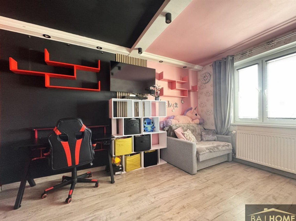 Mieszkanie zostało zaprojektowane i urządzone głównie w kolorach bieli i szarości, dzięki czemu można dobrać dowolnie pasujące dodatki w różnorodnej kolorystyce. Właścicielka zastosowała dodatki w swoim ulubionym kolorze butelkowej zieleni. Sercem mieszkania jest przestronny salon wyposażony w sofę, stół z krzesłami, stolik kawowy i zestaw mebli. Pokój dziecięcy podzielony został na dwie strefy: dziewczęcą - różową oraz chłopięcą czarno-czerwoną jak przystało na gracza komputerowego. Duża, przestronną kuchnia została zabudowana meblami kuchennymi w kolorze białym z frontami lakierowanymi na połysk oraz blatem w kolorze naturalnego brązu oraz wyposażona w niezbędny sprzęt AGD: piekarnik elektryczny z płytą elektryczną, zmywarkę, pochłaniacz oraz lodówkę (nie zostanie w wyposażeniu kuchni).