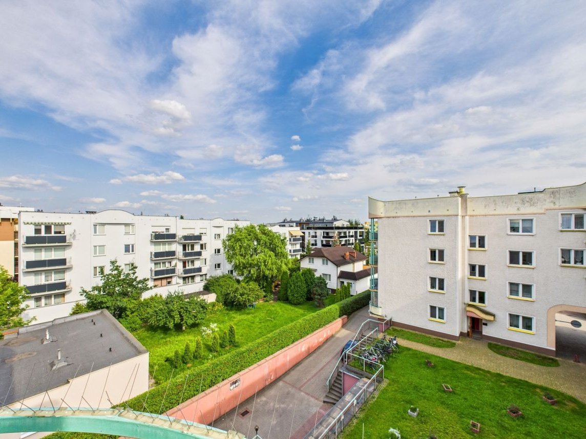 Balkon w rozmiarze kompromisowym. Można tam wystawić krzesło, kwiatka i sąsiadów obserwować z klasą.