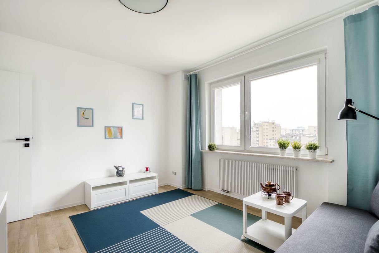 Mieszkanie jest ciepłe - okna od zachodu, piękny widok na nowe warszawskie city, ponadto nikt nie zagląda nam w okna, ponieważ nie graniczy z budynkiem żaden inny wieżowiec. Spokojne sąsiedztwo.
