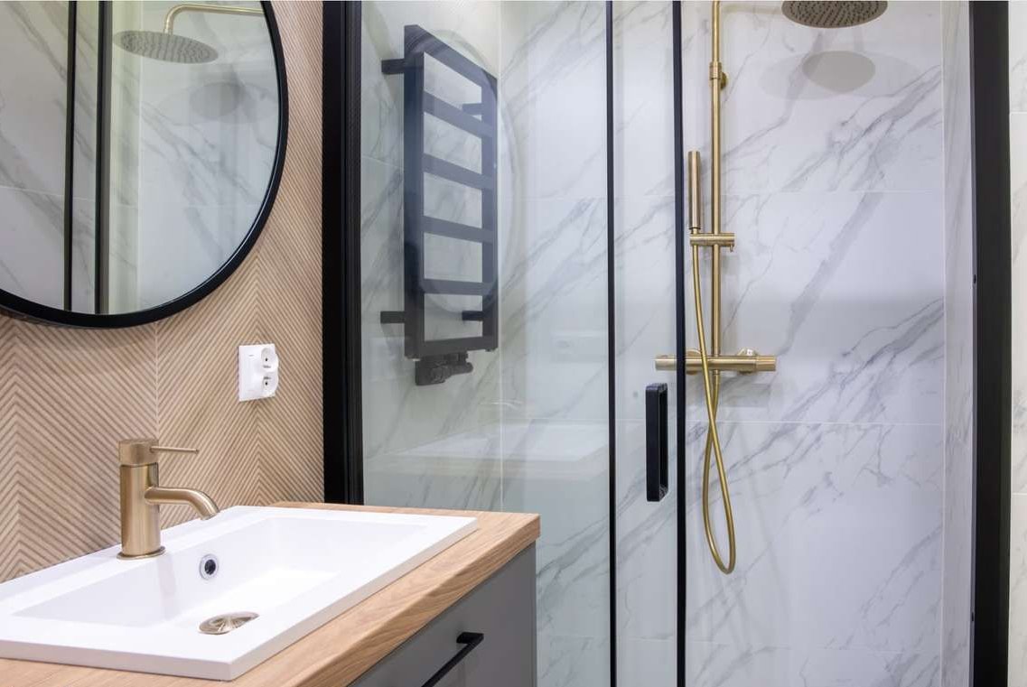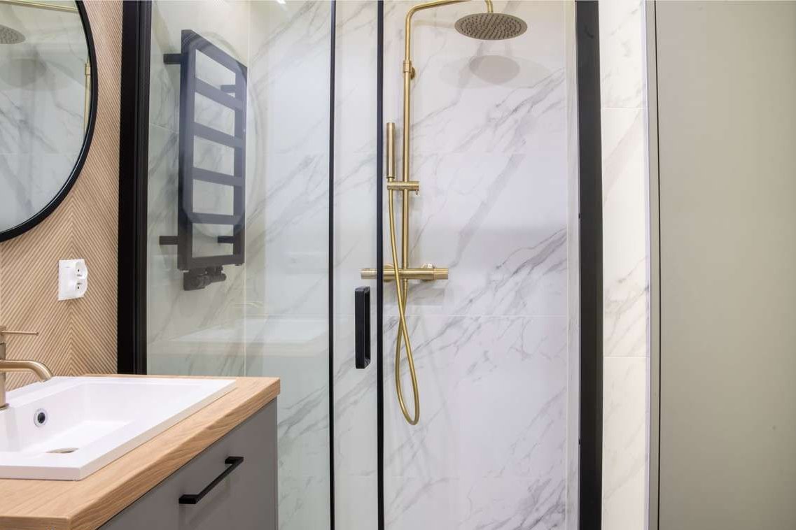 Łazienka z nowoczesnym prysznicem typu walk-in.