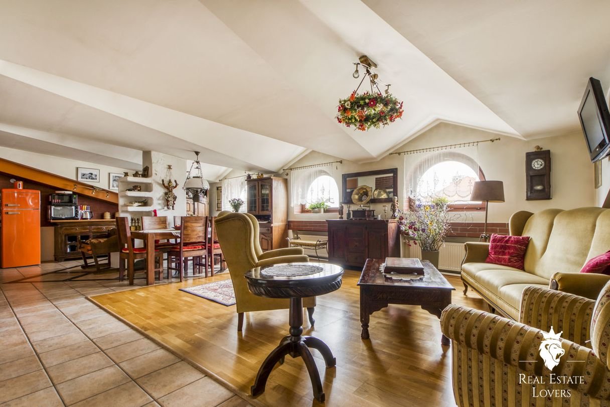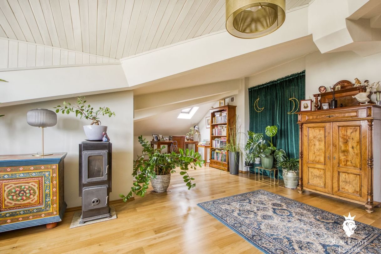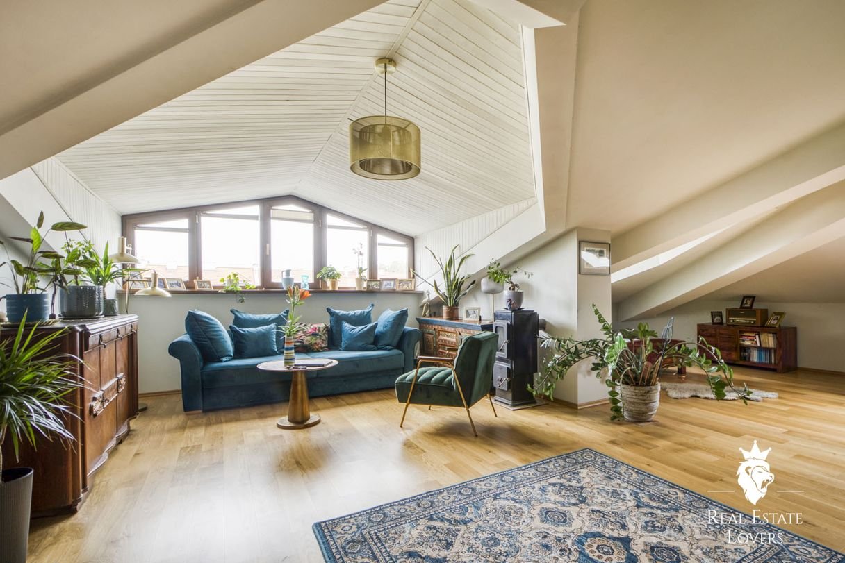 A place where pre-war Warsaw meets the creative energy of today. Over 200 m² of light and character on the top floor of a historic building with a private garden and unique cultural heritage.
