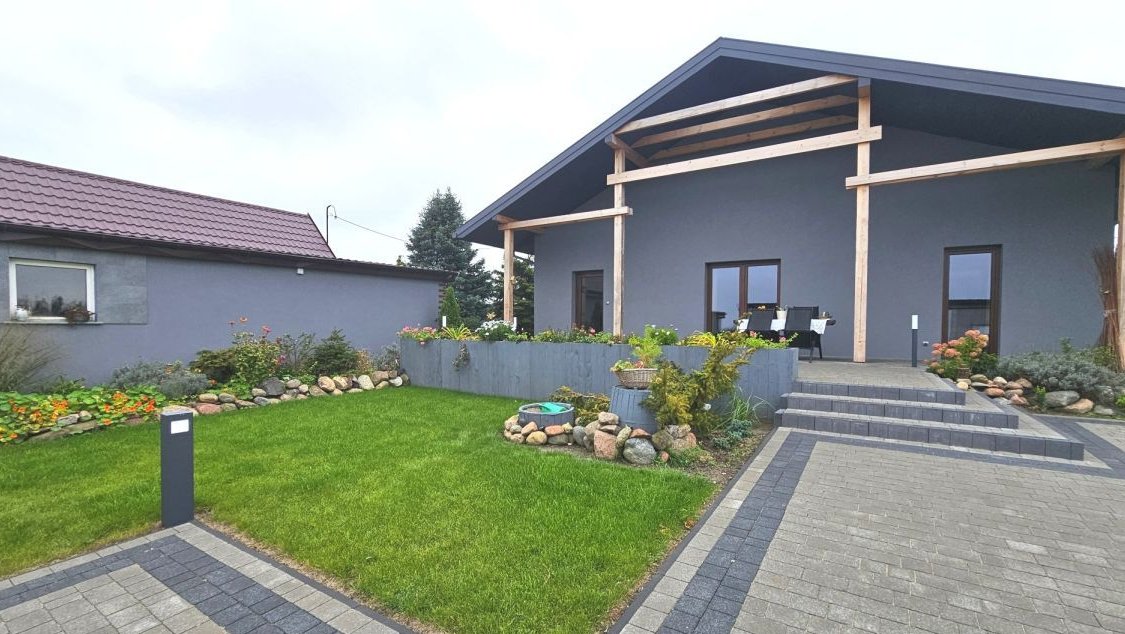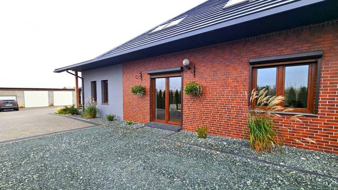 Ten przestronny dom o powierzchni około 220 m² został starannie rozbudowany i odnowiony w tym roku, a jego pozostała część pochodzi z 2000 roku. Całość przeszła modernizację, z dużą dbałością o detale, co czyni go nie tylko pięknym, ale i funkcjonalnym. Dom jest świetnie ocieplony - 20 cm styropianu na zewnątrz oraz 30 cm wełny na poddaszu zapewniają niskie koszty utrzymania, które wynoszą około 600 zł miesięcznie. Dach wielospadowy pokryty blachodachówką dodaje mu elegancji i trwałości.