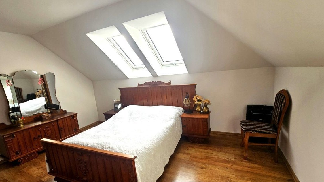 Wnętrze domu jest gustownie urządzone i gotowe do wprowadzenia się. Na parterze znajdziesz przestronny salon z aneksem kuchennym (39,1 m²) z wyjściem na taras, przytulny pokój dzienny z kominkiem (21,8 m²), dodatkowy pokój (9,5 m²), łazienkę (5,4 m²), sypialnię (16,5 m²), pomieszczenie gospodarcze, kuchnię oraz kotłownię (15,3 m²). Na piętrze czekają cztery duże, jasne sypialnie (15, 21, 7,76, 6,78 i 10,91 m²) oraz kolejna łazienka (3,10 m²). Całość wyposażenia pozostaje w cenie, co czyni ofertę jeszcze bardziej atrakcyjną.