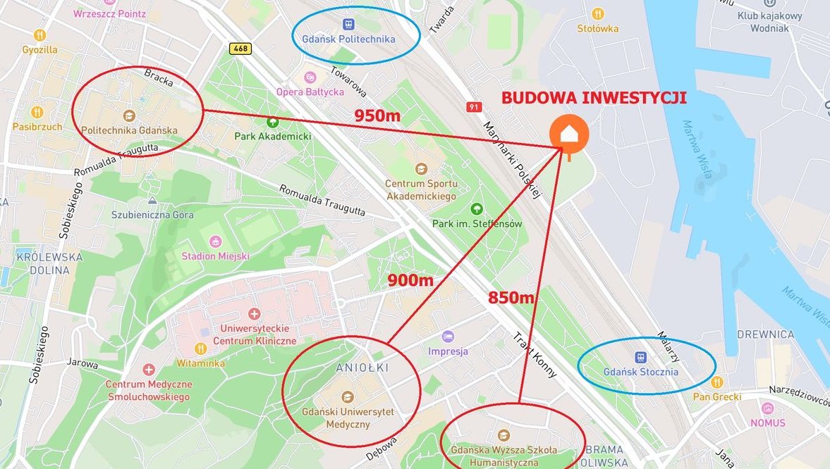 Wysoki potencjał wynajmu dla studentów: lokalizacja Gdańsk Wrzeszcz/Młyniska przyciąga studentów z Polski jak i zagranicy oraz osoby pracujące.