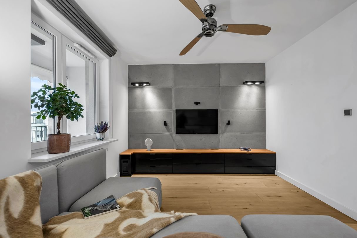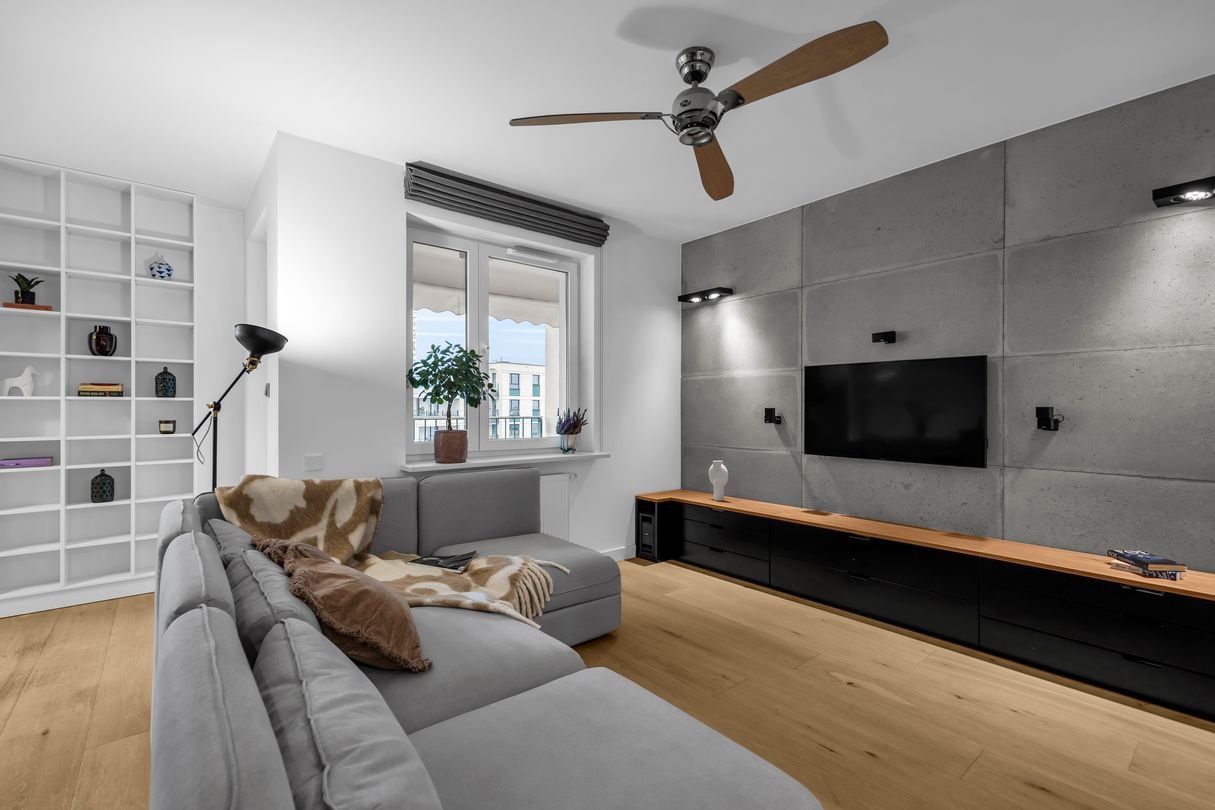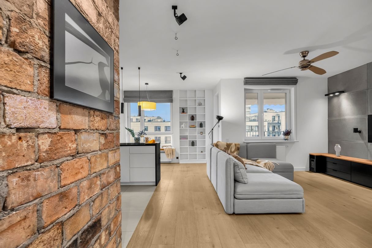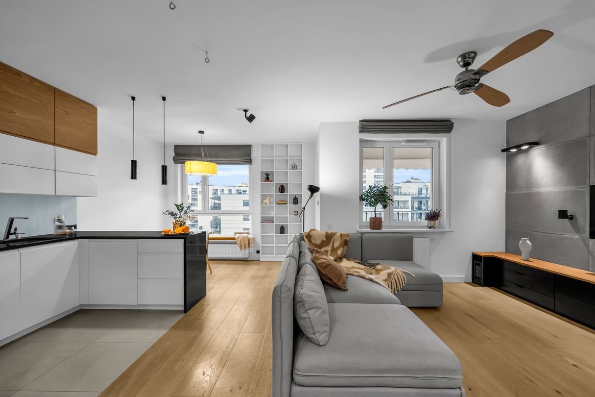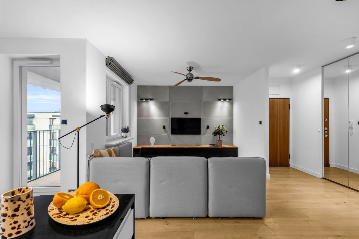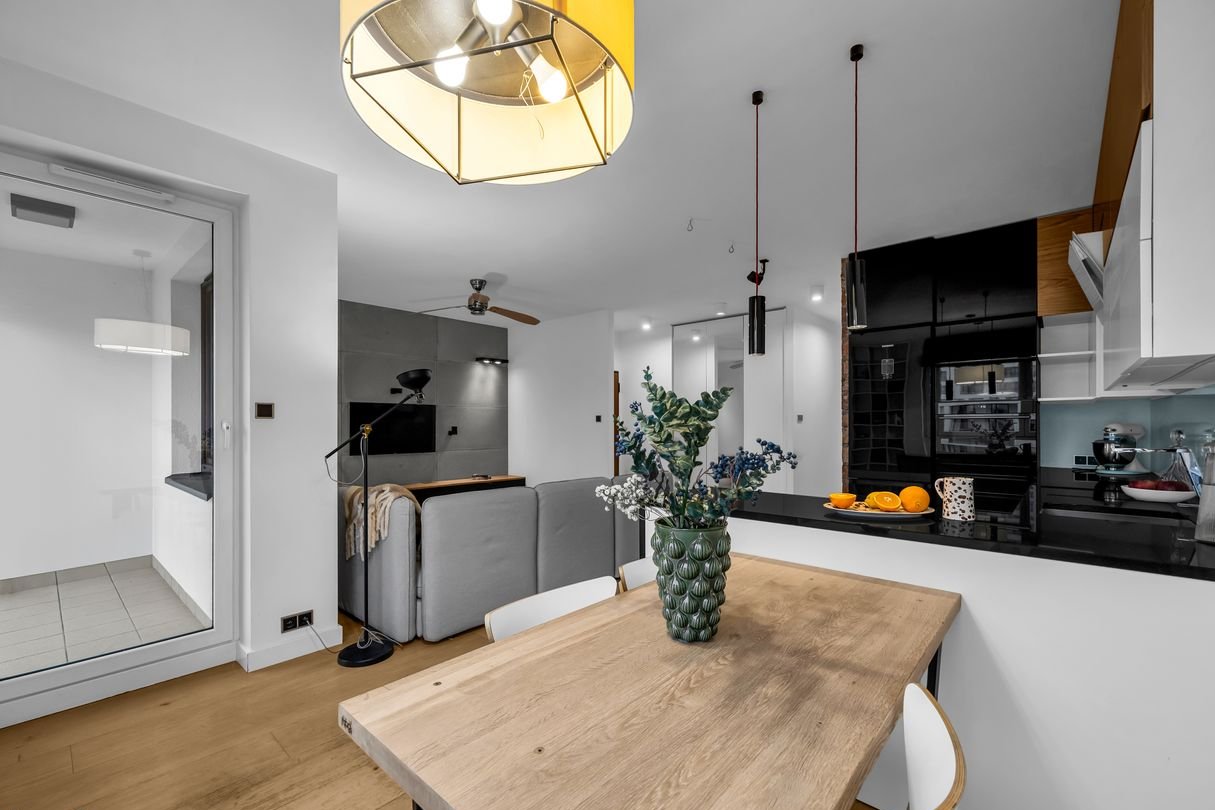 Okna z salonu wychodzą na zachód. Dodatkowo do nieruchomości przynależy balkon idealny na poranną kawę oraz dwa miejsca postojowe w garażu podziemnym (jedno miejsce postojowe wraz z boksem jest obowiązkowe). W lokalu znajdują się m.in. dębowa podłoga, kuchnia z pełnym wyposażeniem i kamiennymi blatami, garderoba oraz szafy w zabudowie. Całość wykończona z dbałością o komfort, m.in. ogrzewanie podłogowe i wiatraki sufitowe.