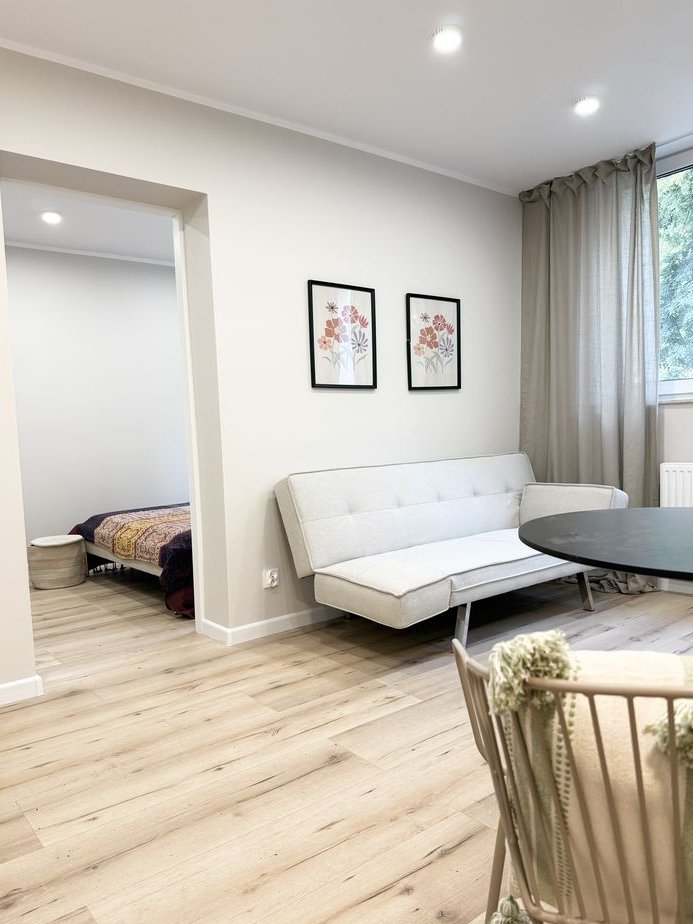 W mieszkaniu stworzyliśmy funkcjonalną przestrzeń salon, kuchnia, wydzielona przestrzeń do spania: