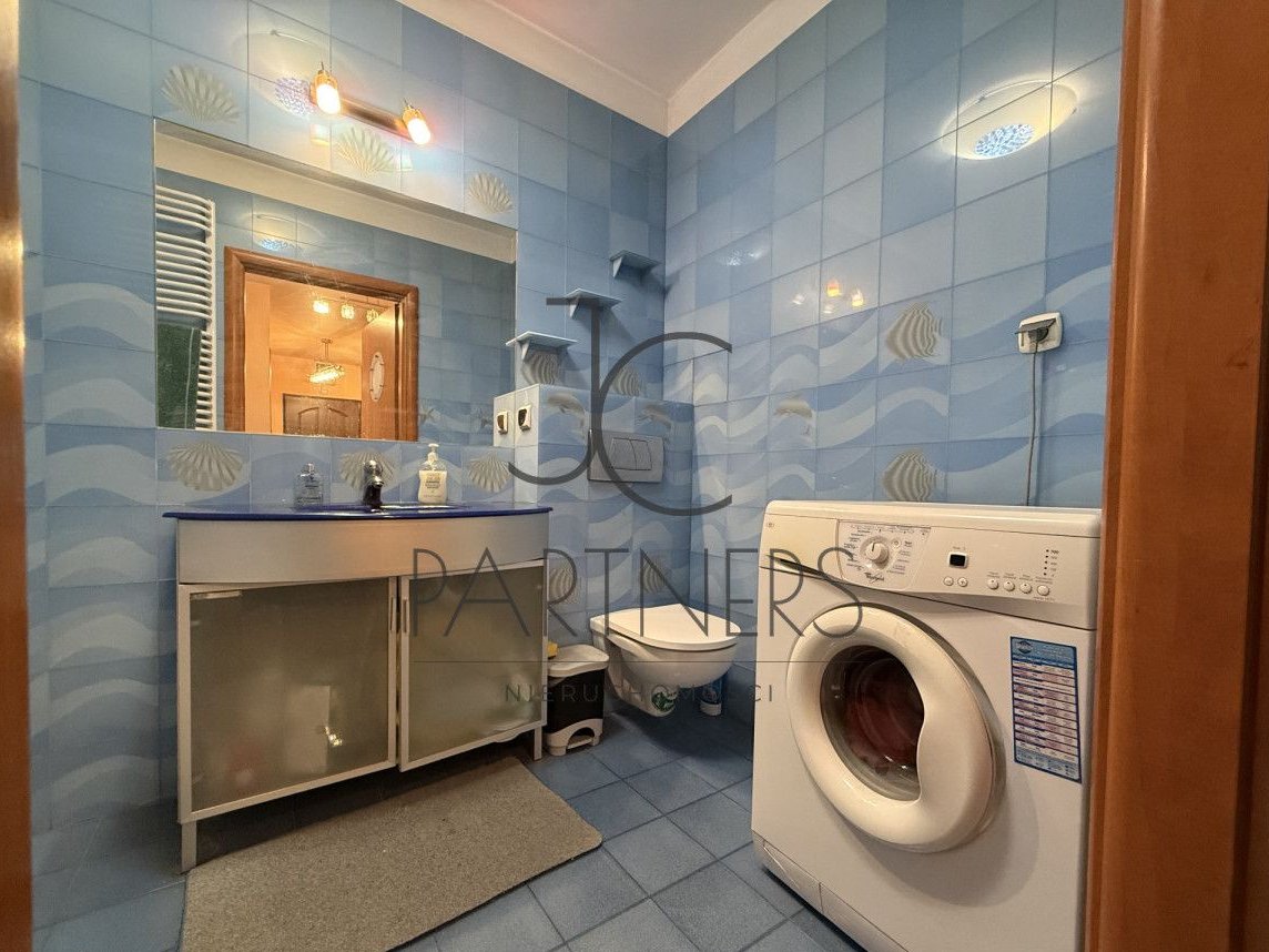 Mieszkanie posiada widną, oddzielną kuchnię z meblami, łazienkę oraz osobne WC, co zwiększa komfort codziennego użytkowania. Na podłogach znajdują się panele oraz terakota, a wejście do lokalu zabezpieczają drzwi antywłamaniowe. W salonie klimatyzacja