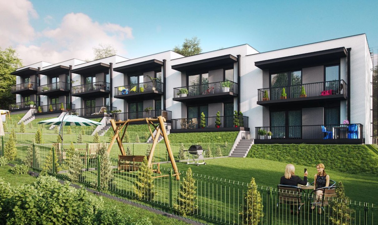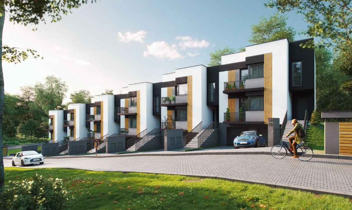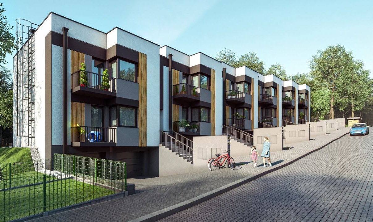Domy w zabudowie szeregowej, w których wydzielone są po 2 mieszkania o metrażach 55 m2 na parterze i 65 m2 na piętrze. Do mieszkań na parterze są przypisane duże ogródki od 50 do 100 m2, gdzie można urządzić strefę wypoczynku, mini plac zabaw czy też miejsce na grilla. Dodatkowo do każdego mieszkania na piętrze przynależy garaż dwustanowiskowy, miejsce postojowe przed budynkiem oraz komórka lokatorska