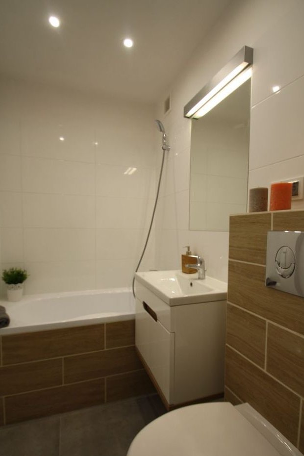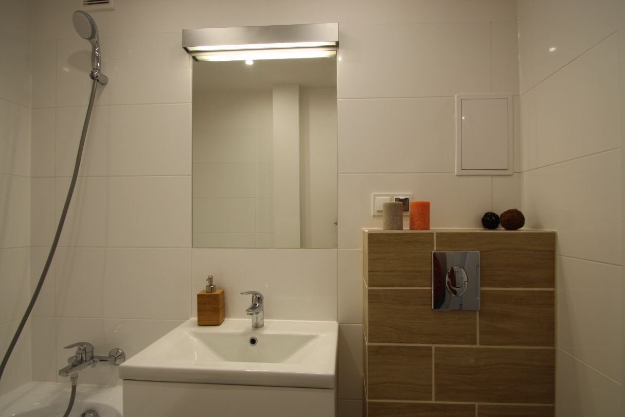 - łazienka: na ścianach i podłodze nowe płytki, urządzenia sanitarne również nowe: umywalka z szafką podwieszaną z dwoma szufladami i baterią oraz prysznic z baterią prysznicową,